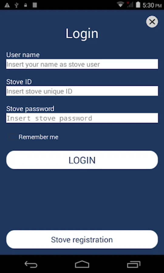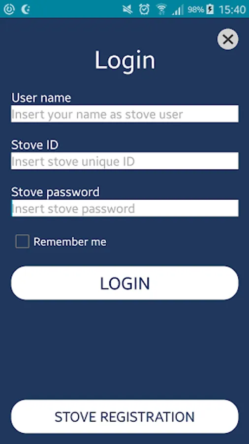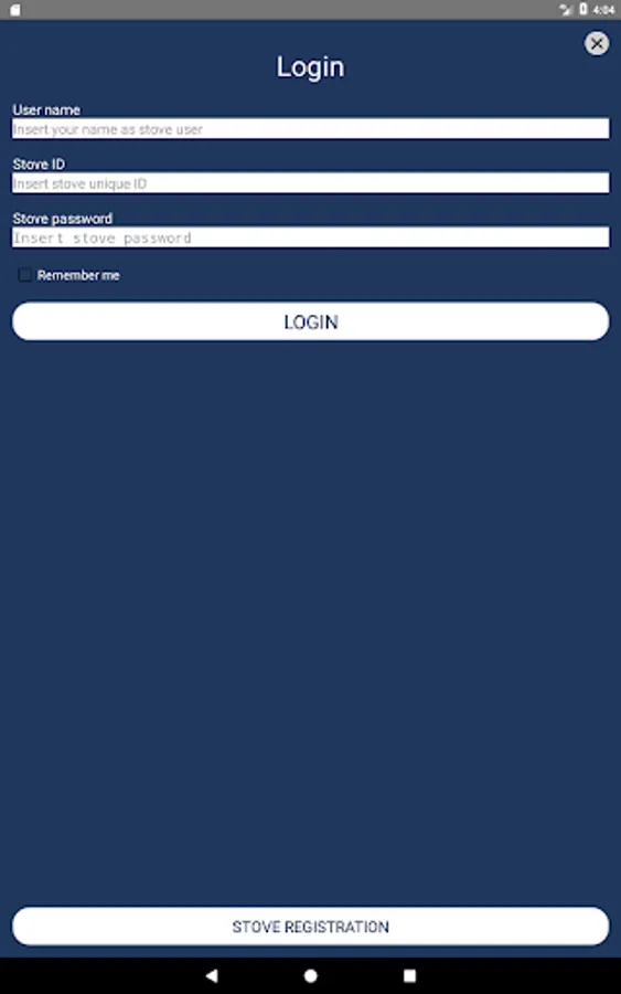 To use this app, login to selected stove is mandatory. At first usage new stove has to be registered: stove registration has to be performed once and for all.
