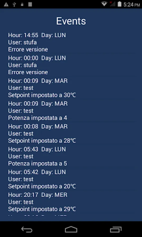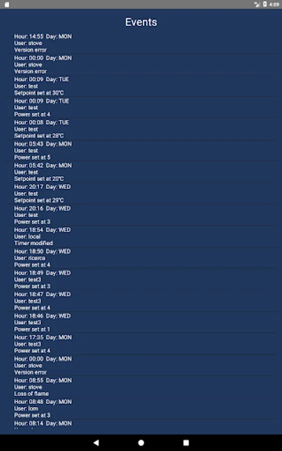 Remote users can also program stove, modifying main parameters as operation set point and power, operation mode and timer. Only one remote user at once is allowed to program stove; during remote programming performed by an user, other remote users have readonly permission. Local users have higher controlling priority than remote users.