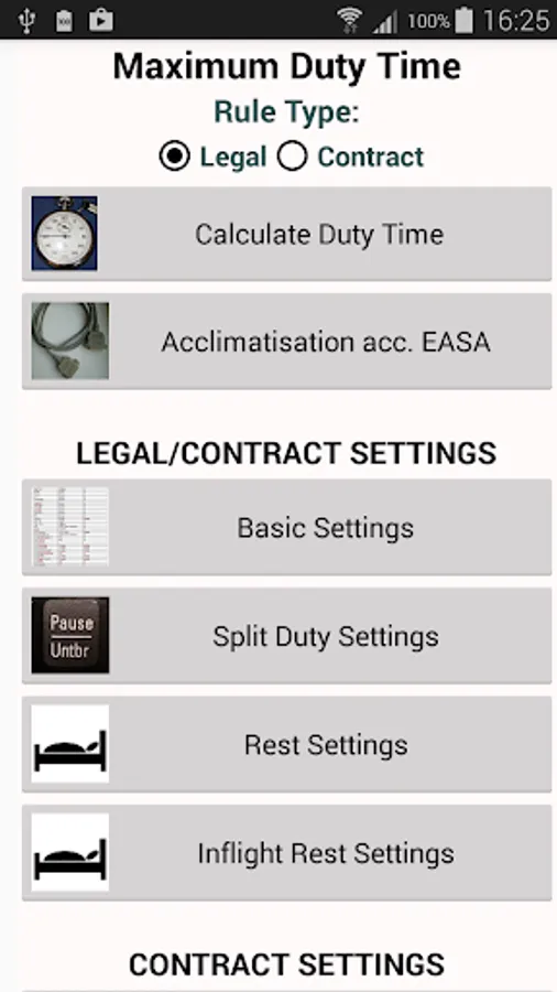 Additionally, it is possible to maintain a second set of rules to reflect conditions of a work contract. You can calculate duty time also on this set of rules, but be careful as you can (with some limitations) freely create these rules and they are not checked against legal limits! This contract rule set is rather basic and only supports basic duty periods, stytic rules, split duty and inflight rest.