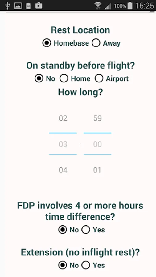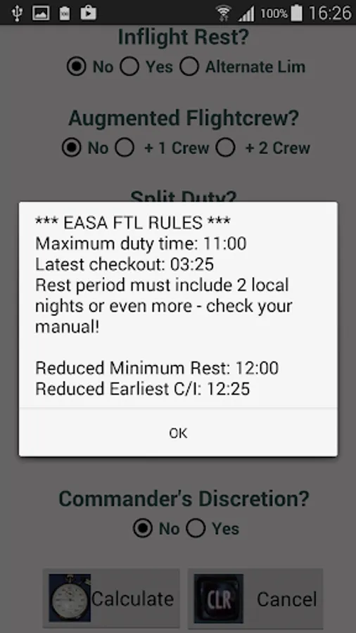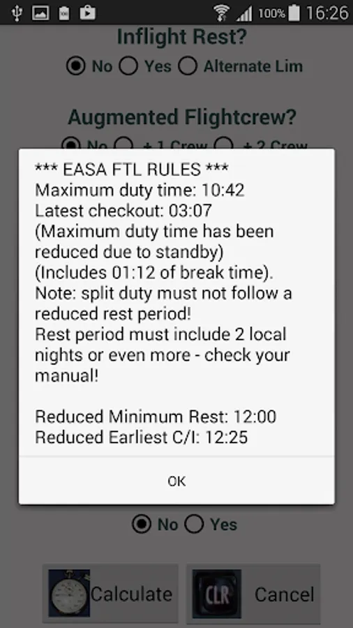 With this app you can easily calculate your maximum flight duty period if you are a pilot operating under EASA FTL regulations. The current rules as of April 2016 are implemented - check your duty time in regard to basic duty period, extensions, inflight rest, split duty, commander's discretion and more! Some settings can be modified within the legal limits (for example, if a FRM is in place or your rosters are of the early or late disruptive type). You can also check your acclimatisation status.