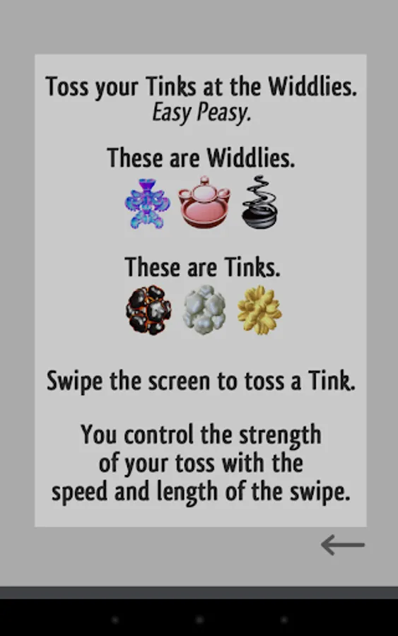 Widdly Tinks is a simple, physics-based arcade game. You score points by tossing your Tinks onto wobbling, tipping, and swinging targets.