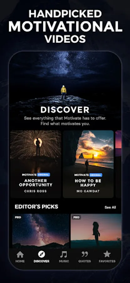 Motivate is your first step towards a more driven, focused and inspired life. Experience empowering full-length speeches from some of the world's most inspiring speakers exclusively in-app. Watch five new motivational videos each day or browse our library of thousands of videos including categories and curated playlists. Listen on the go with background play and build your daily habits with positive reminders from customizable notifications. View, favorite and share thousands of inspiring quotes directly in the app or see them on your Home screen with the Quotes Widget. Enjoy exclusive music to get you inspired, energized, relaxed or focused. Whether you're waking up, at work, in the gym or just need that extra boost to get you through the day, Motivate has you covered.