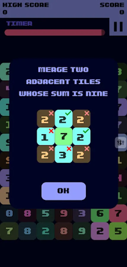 Combine two adjacent tiles with a sum of nine, clear all before time runs out.
