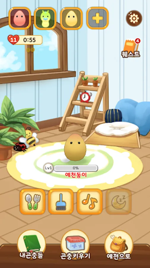 Bugs Hideout is a game where you can learn various information about insects by raising various insect friends from eggs to adults and going through growth activities from release to release.