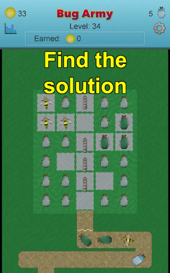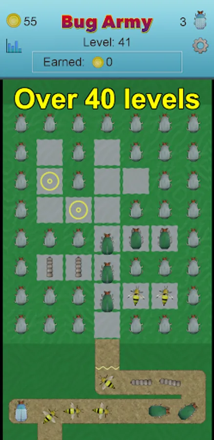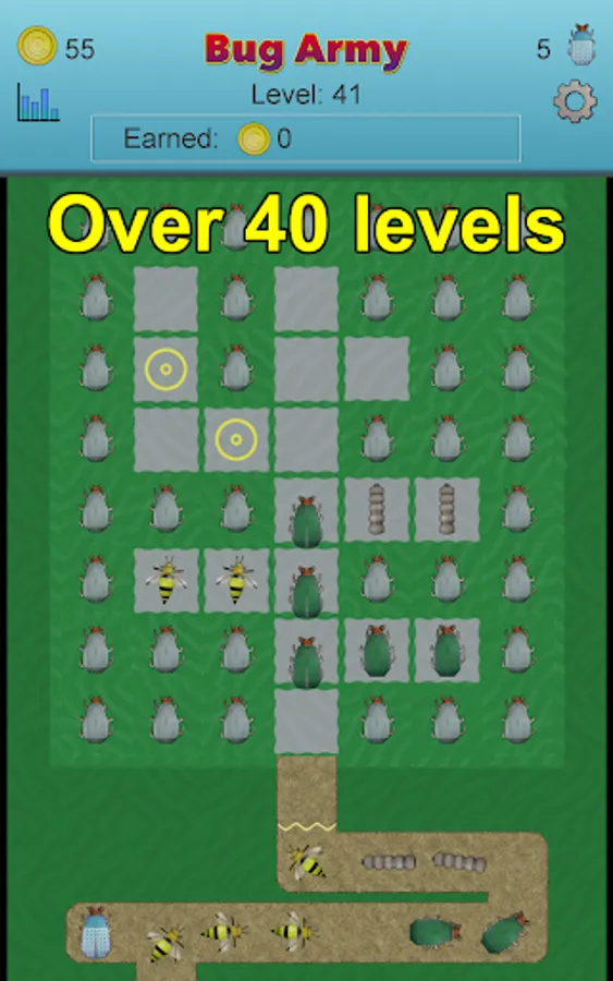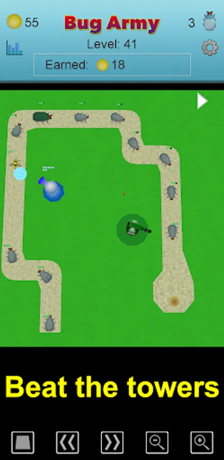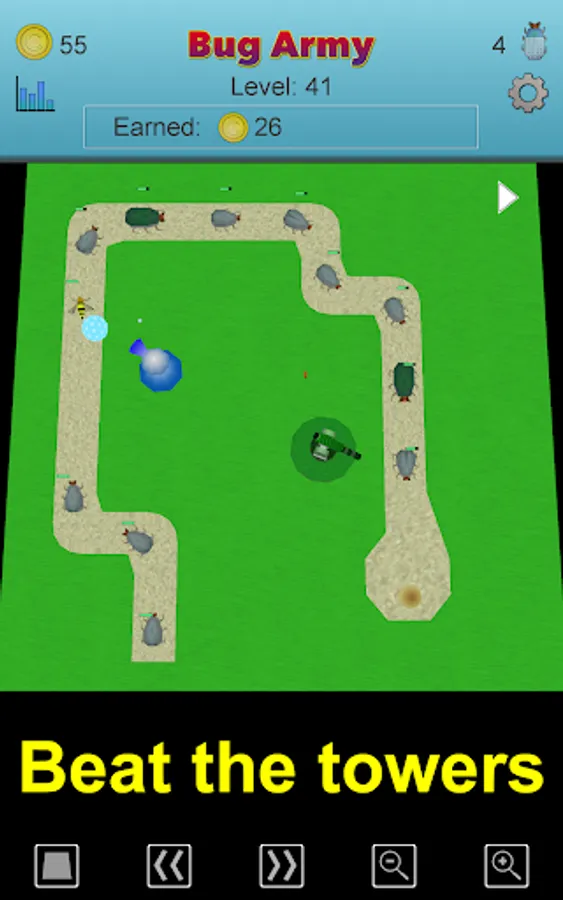 Each of the bugs have their own relative Speed, Health, Shell, and Push. And you can earn coins on each level and buy power-ups for each bug. Speed means how fast the bug can move past the towers. Health determines how many hits a bug can take. Shell is how much of a hit a bug can deflect. And Push is how much one bug will speed up the bug in front of them.