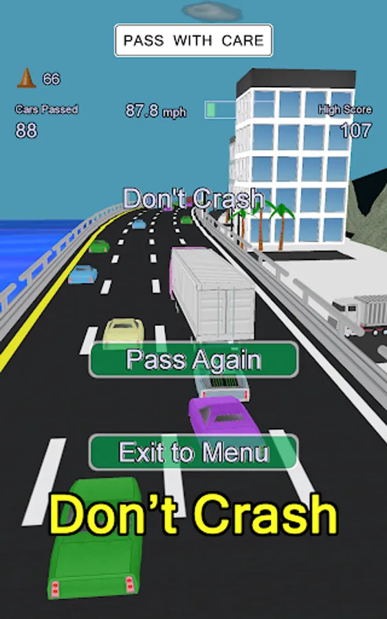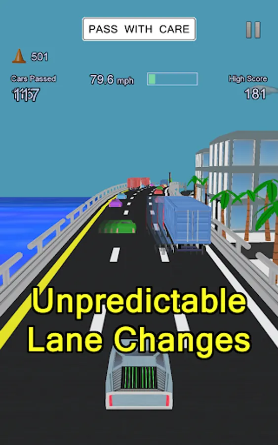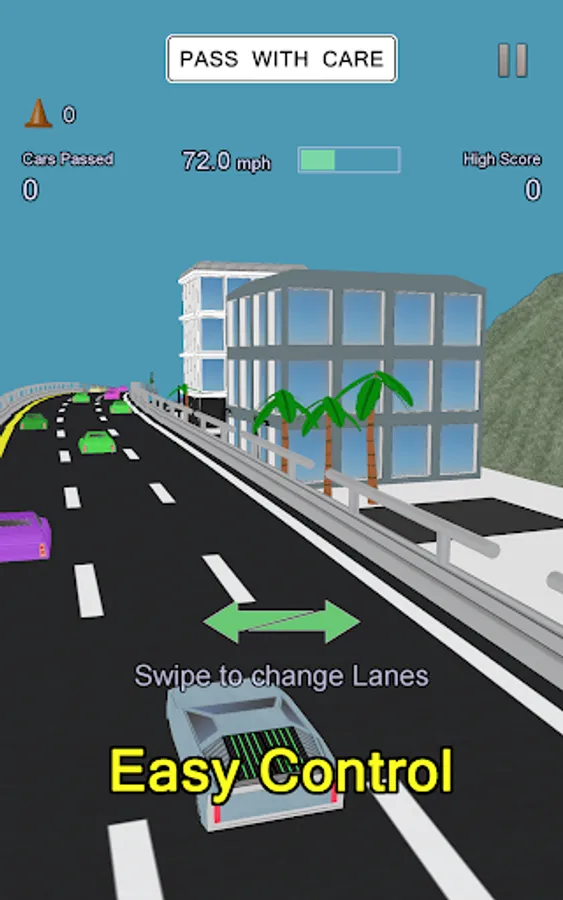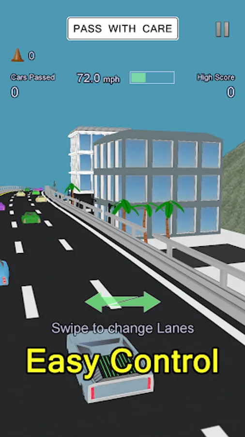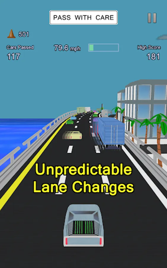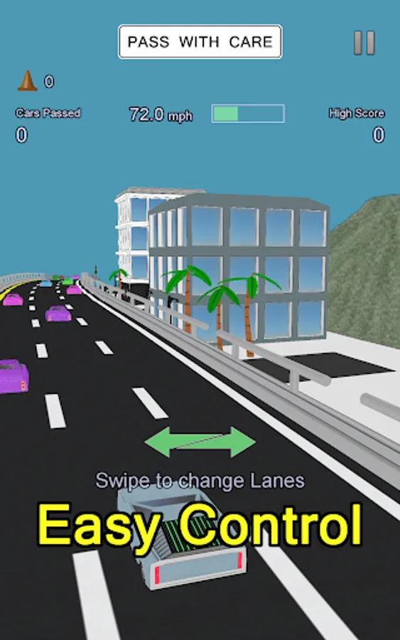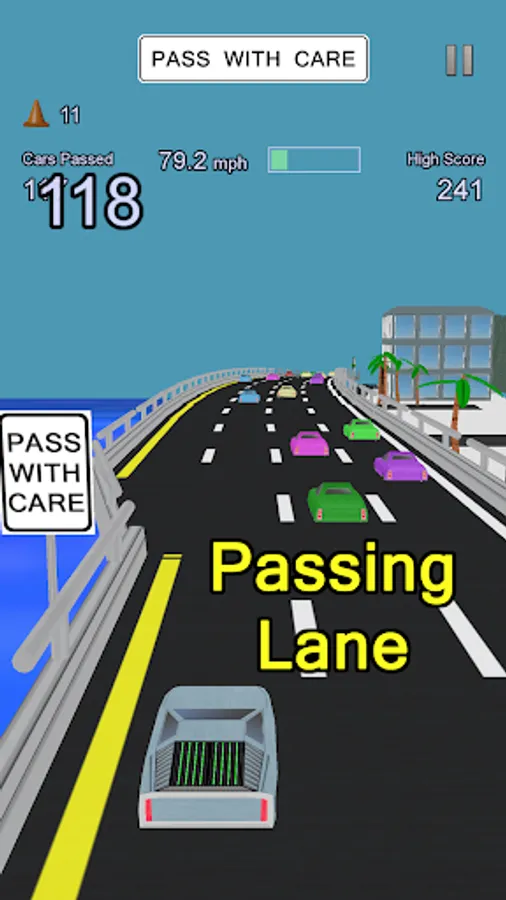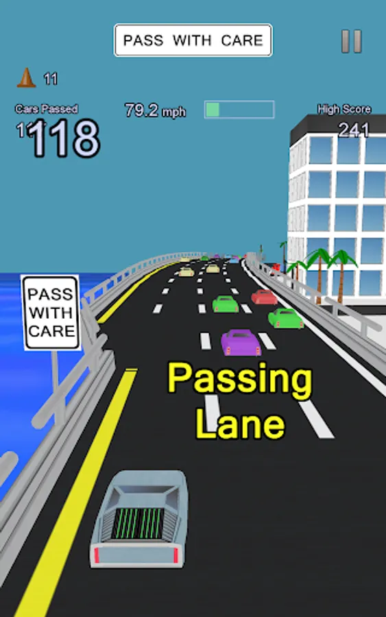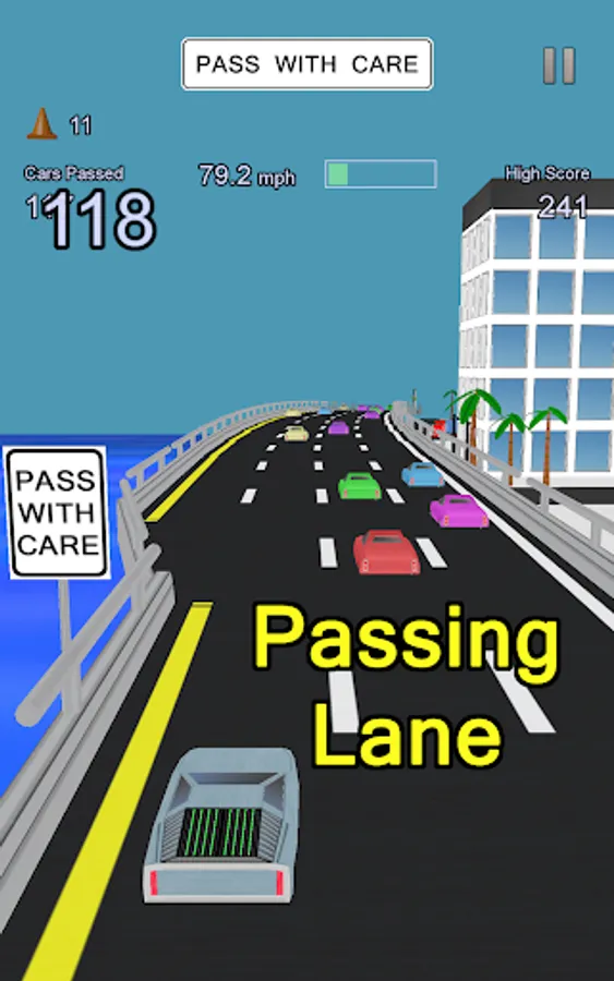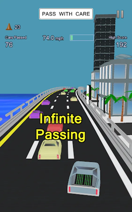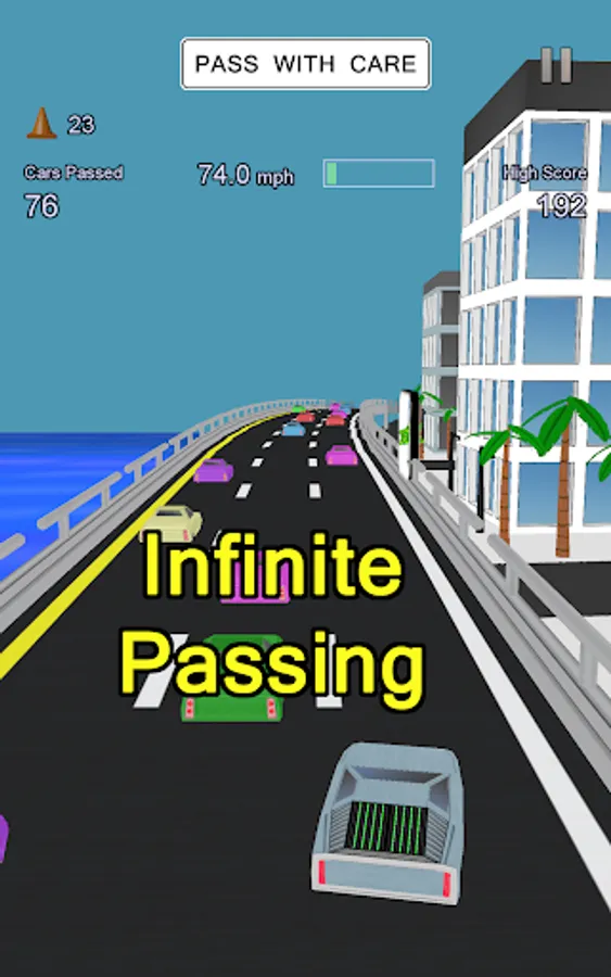 Ever notice it is easy to go faster than every other car on the road. There is no slower - only faster. Maybe it's not in your control - maybe you have a lead foot. The only thing to do is pass all the cars and trucks on the roadway. You can Pass With Care if you avoid crashing into all the other vehicles on the road in this infinite passing game.