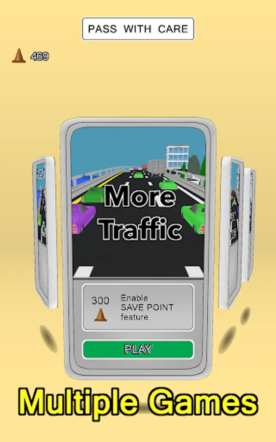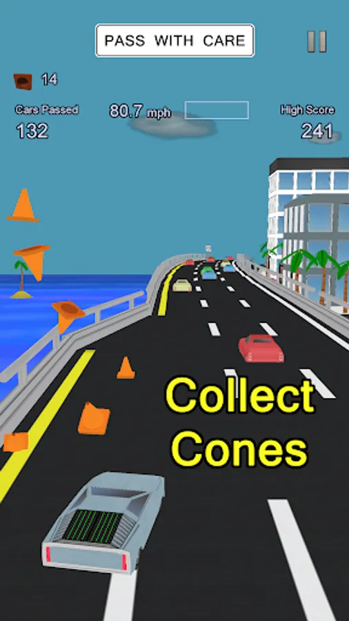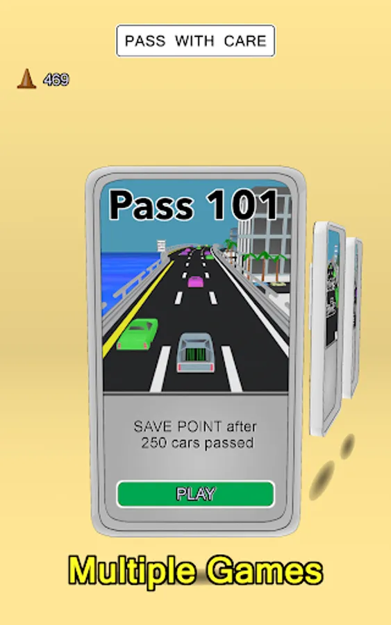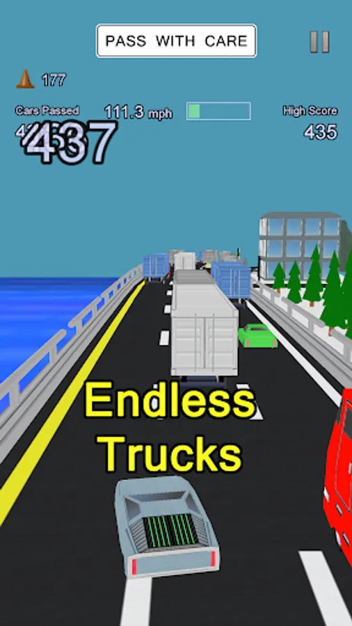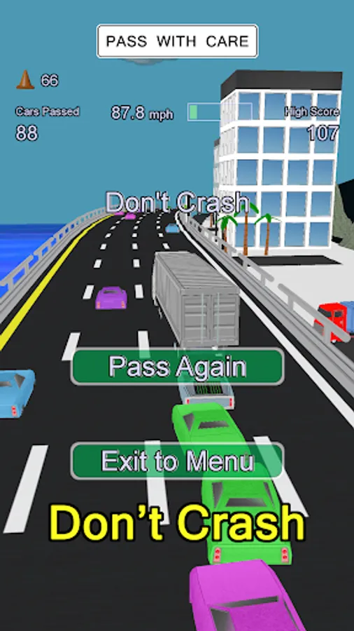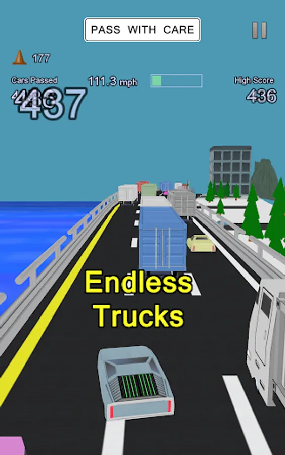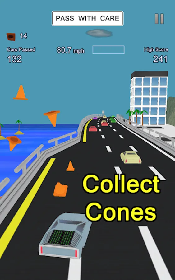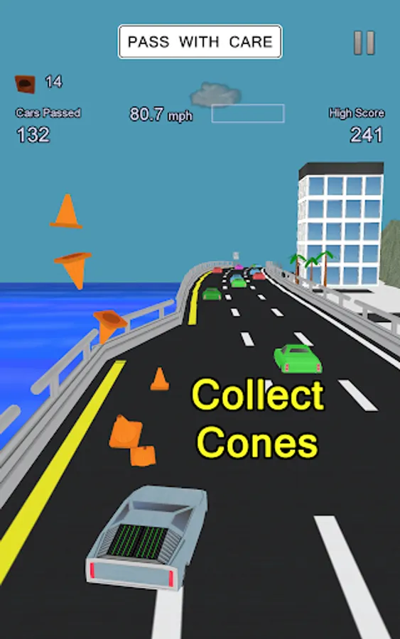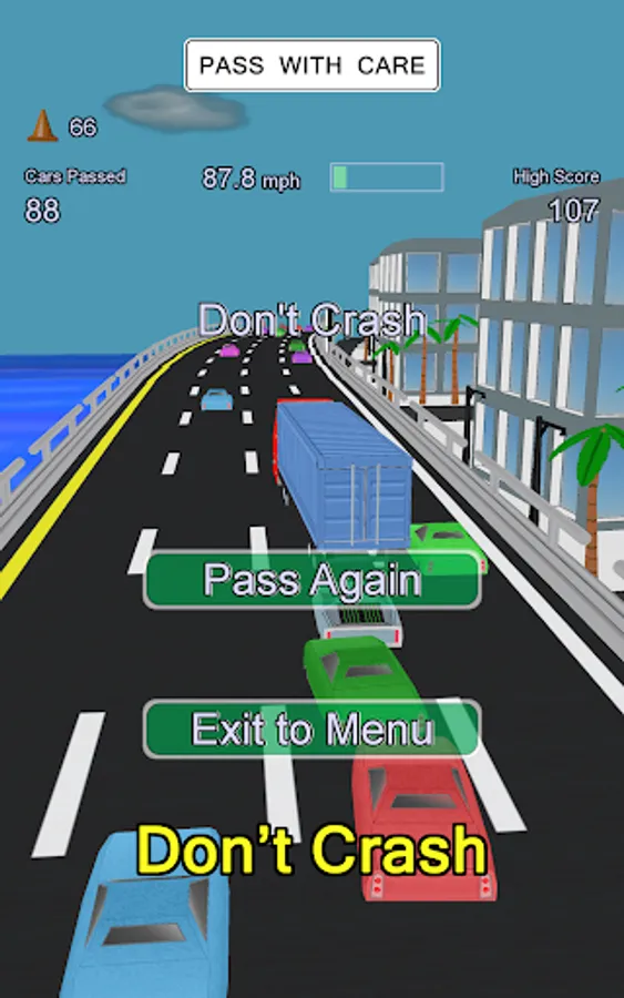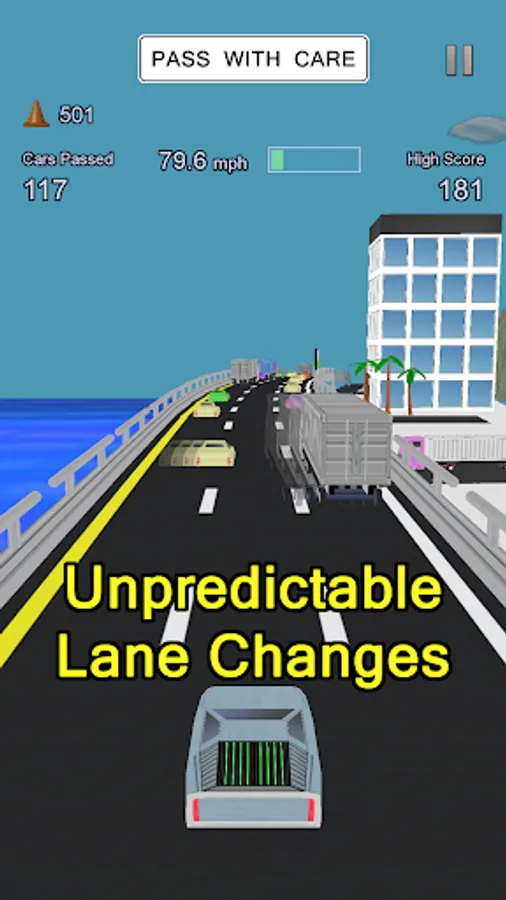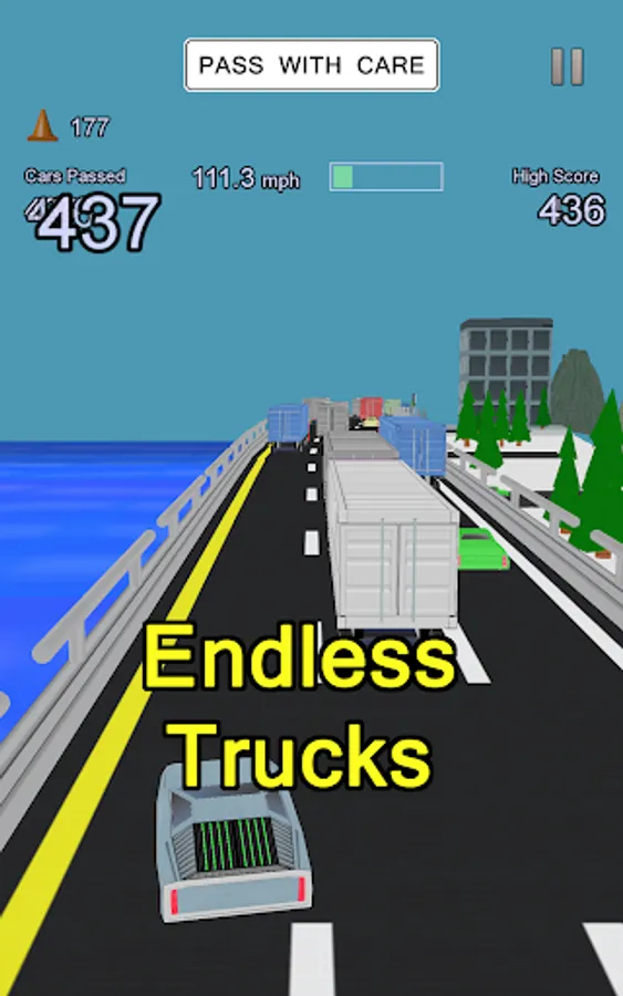 Ever notice it is easy to go faster than every other car on the road. There is no slower - only faster. Maybe it's not in your control - maybe you have a lead foot. The only thing to do is pass all the cars and trucks on the roadway. You can Pass With Care if you avoid crashing into all the other vehicles on the road in this infinite passing game.