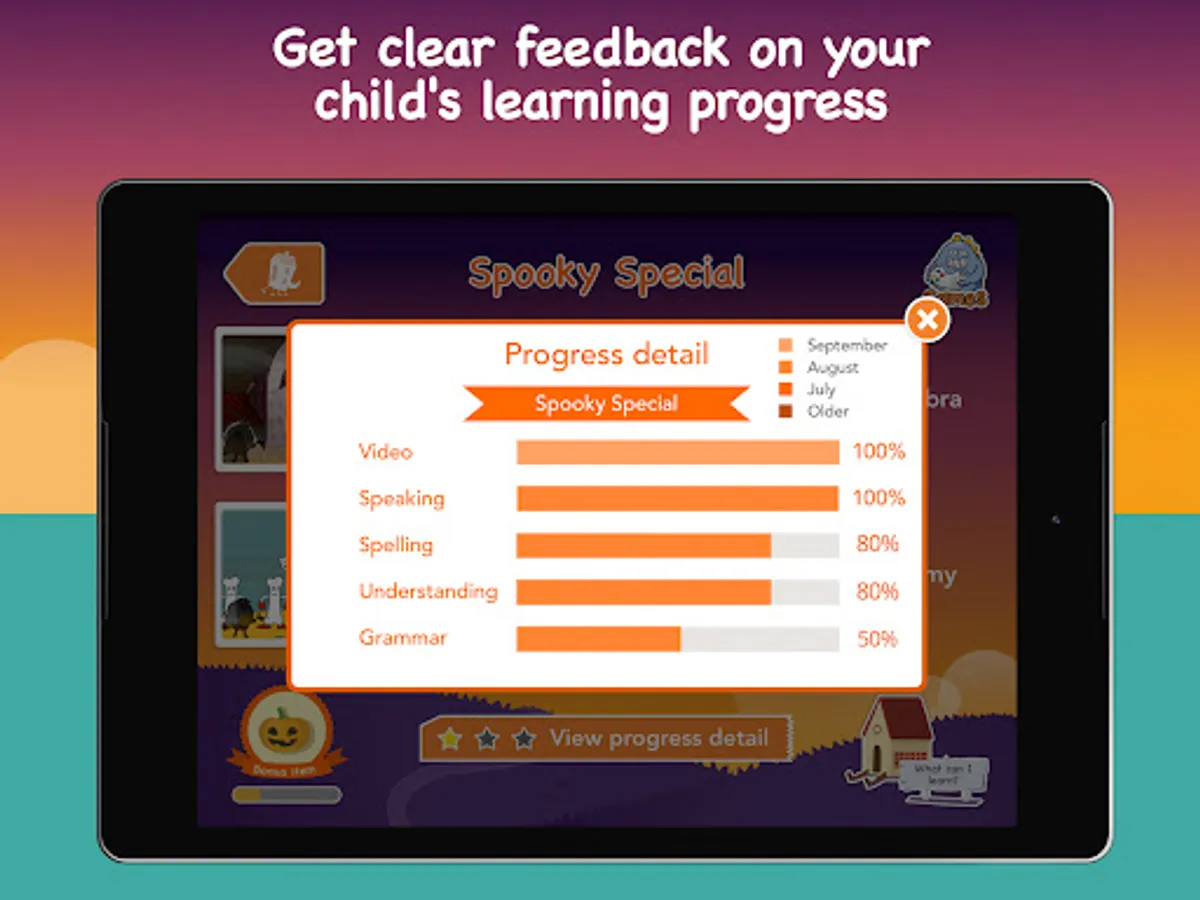 In each pack you can see how your child is progressing in five areas: Videos, Speaking, Spelling, Understanding and Grammar.
