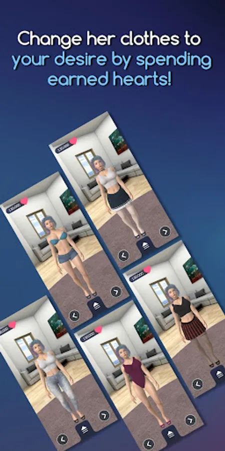 - Change her clothes, hairstyle and environment to your desire by spending earned hearts