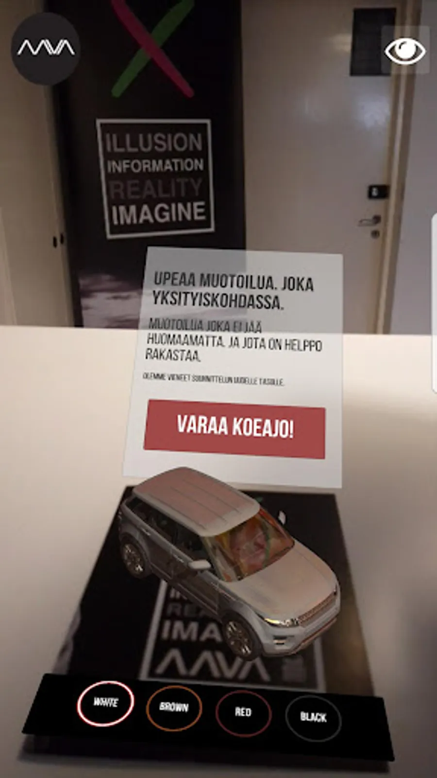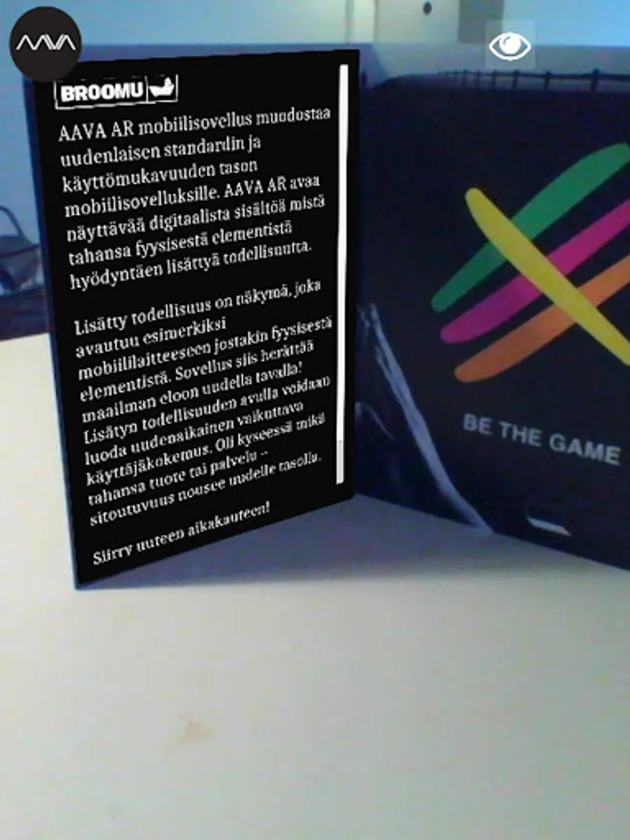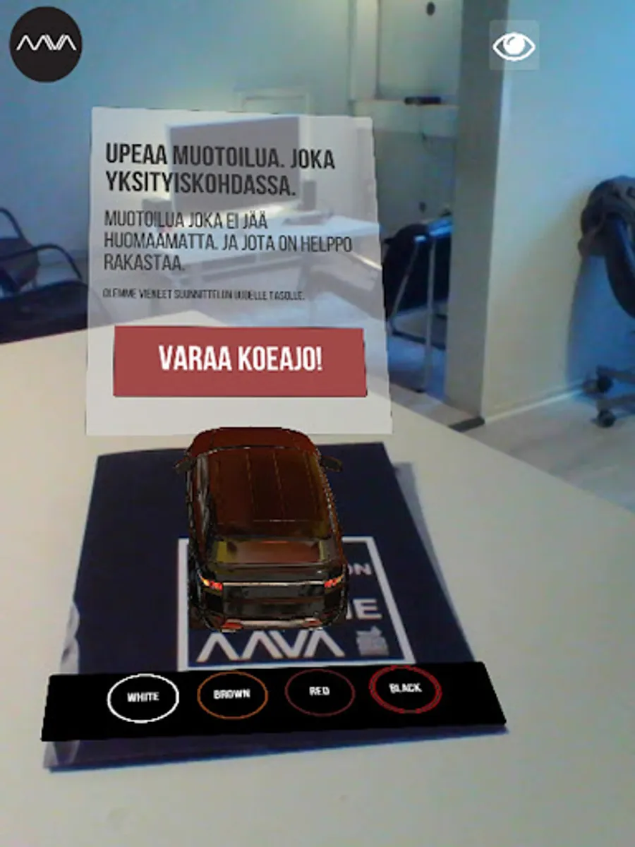 AAVA AR is a high end augmented reality app to combine digital elements into our surroundings. AAVA supports marker based technology, location based technology and also marker free technologies. It is also worlds first data driven AR solution.