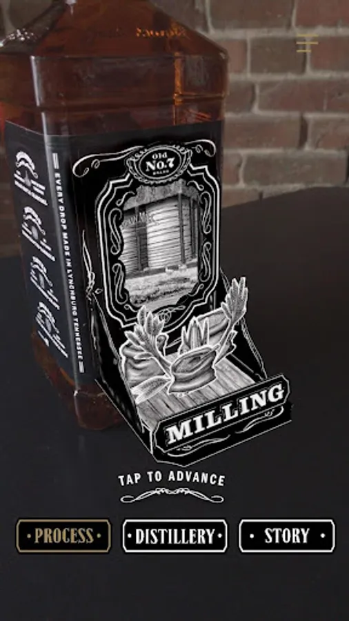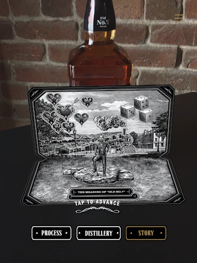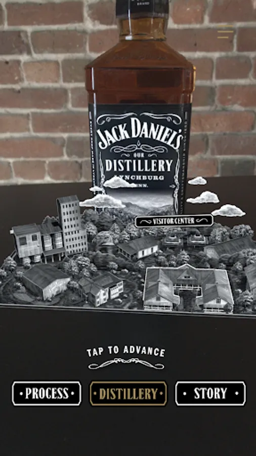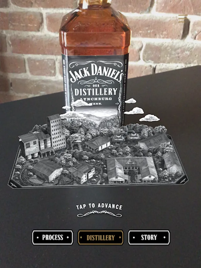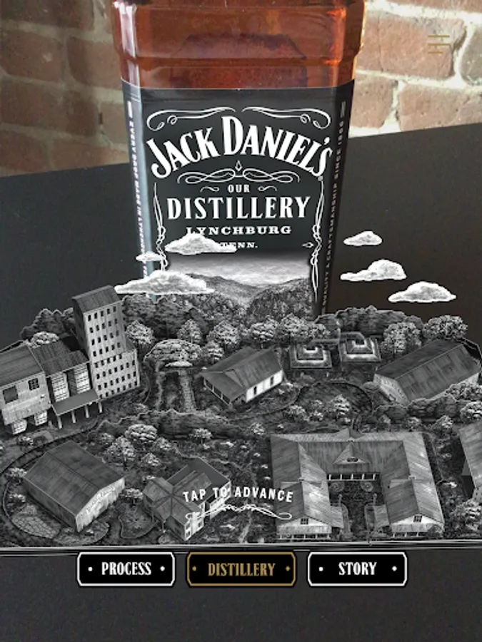 The AR experience is divided into three unique parts, each designed with the look and feel of hand-crafted models and integrate real-time, environmental lighting and textures. The first experience transforms the front label of the bottle into a miniature version of the Jack Daniel Distillery. The second walks step by step through the process of making Jack Daniel’s Tennessee Whiskey, and the third shares stories of the man himself, Jack Daniel.