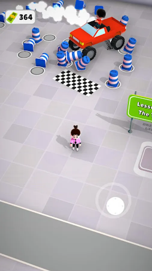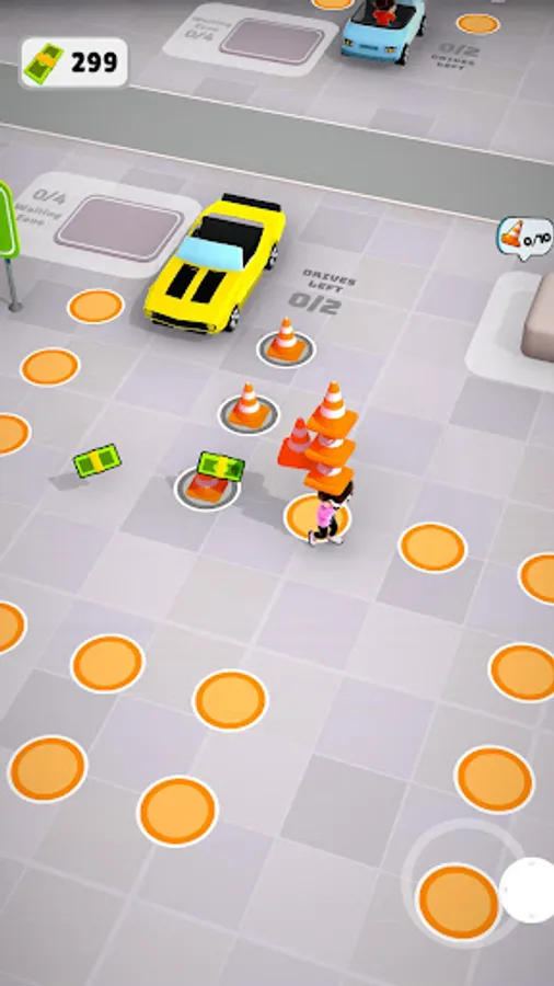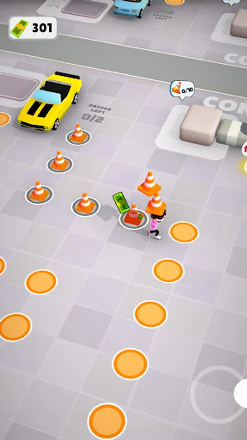 Pickup cones and place them on path to help dumb customers with the driving path. Customers will reward you with money for every lesson you give. They are dumb and keep crashing your vehicles, you'll have to clean up the mess and make sure they know where to drive.