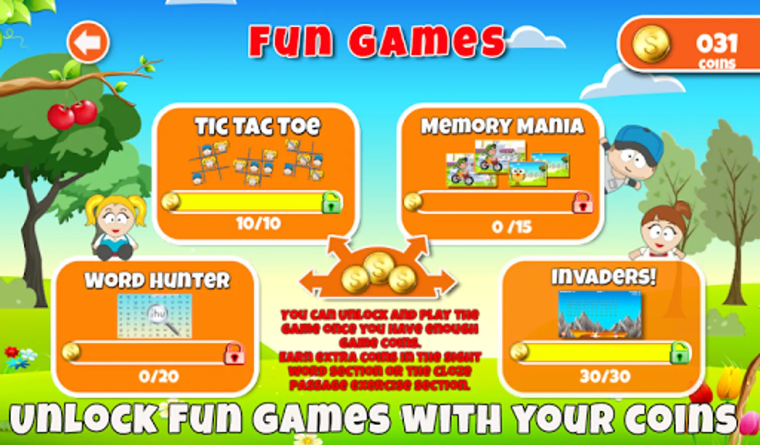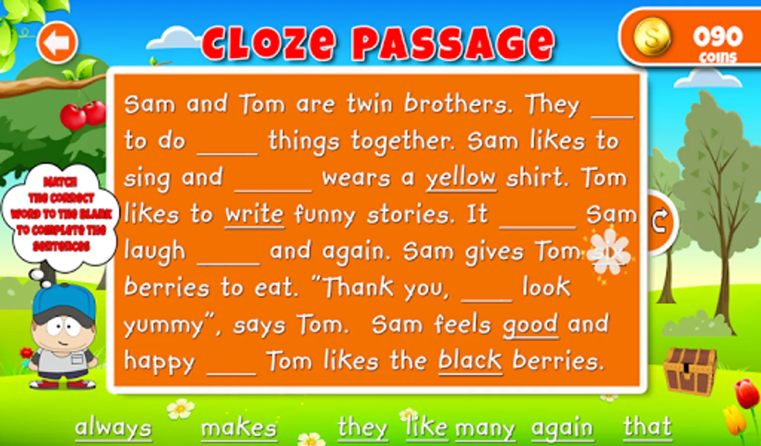 * Rewards system where game coins can be collected at the end of each lesson or cloze passage exercise.
