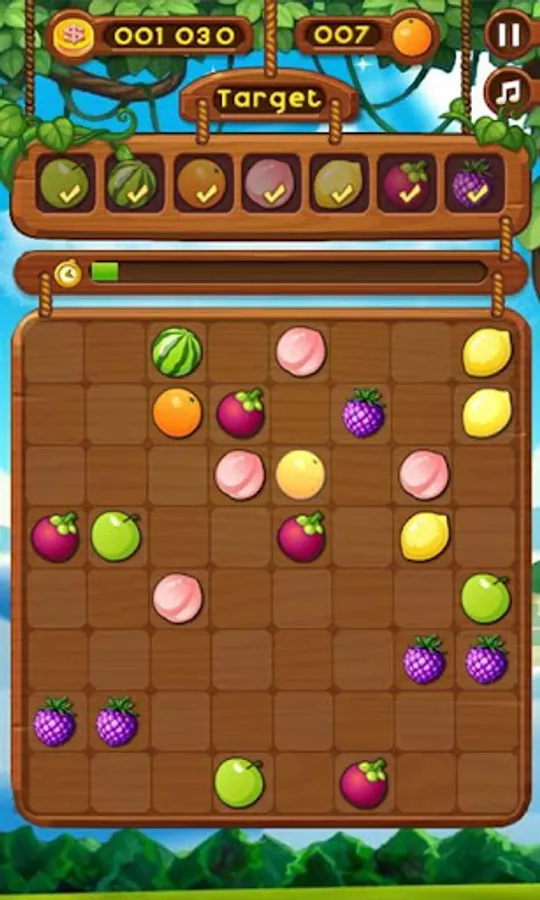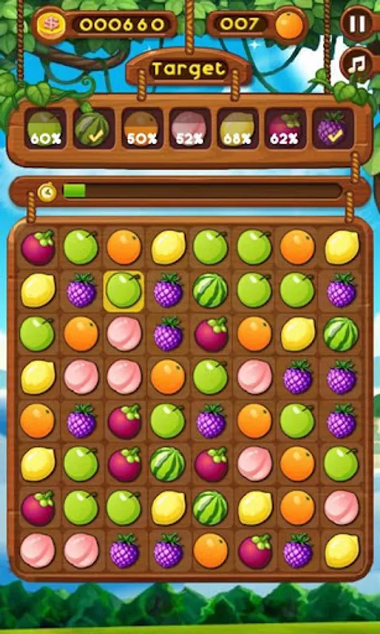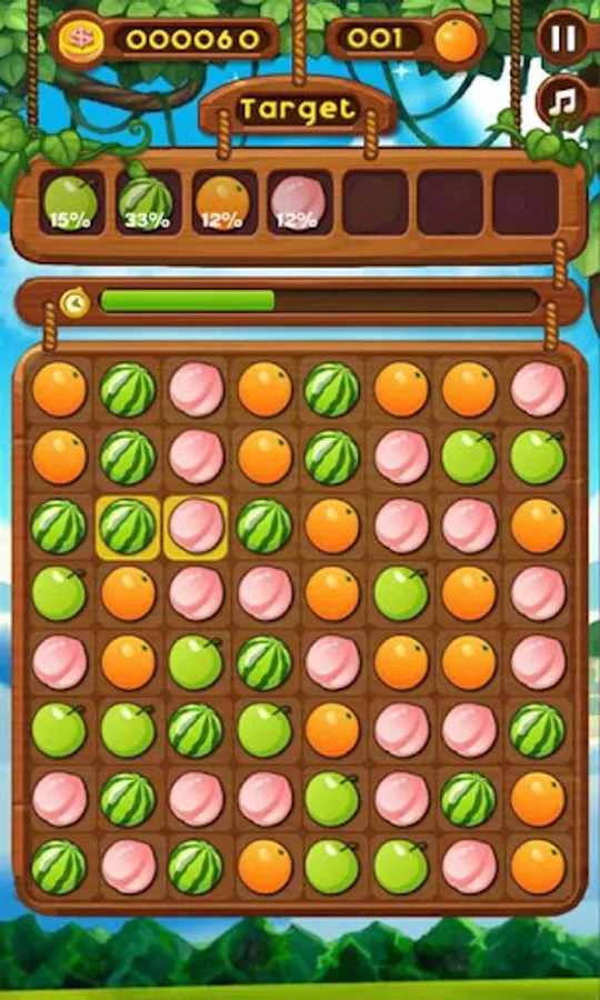 3(or more) the same fruits being connected in a line, they will be removed,Switch and match fruit to challenge HighScore!!