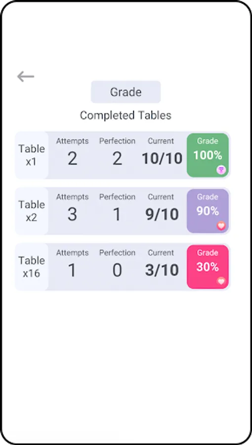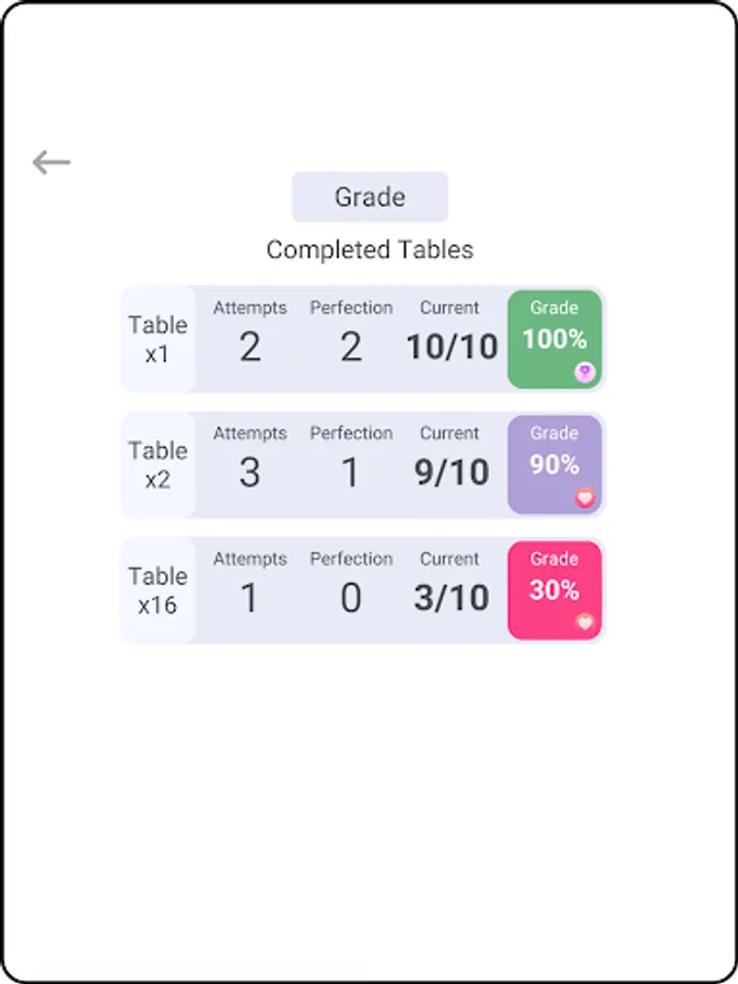 Keep track of a student’s performance and progress with the report card option. The Report Card shows information about which tables to improve and practice more, the number of times a quiz has been taken, percentage grade, number of correct answers, number of perfect scores and the tables a student is excelling at. Report Cards are available for each quiz taken.