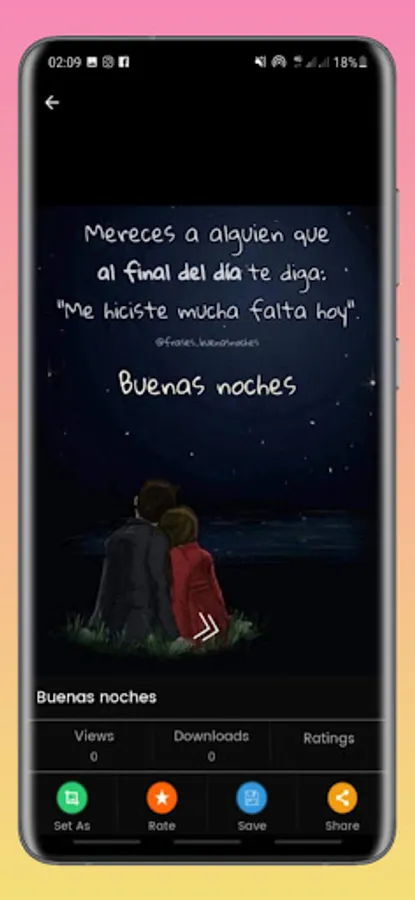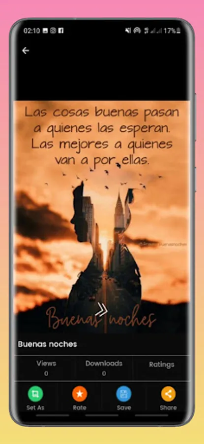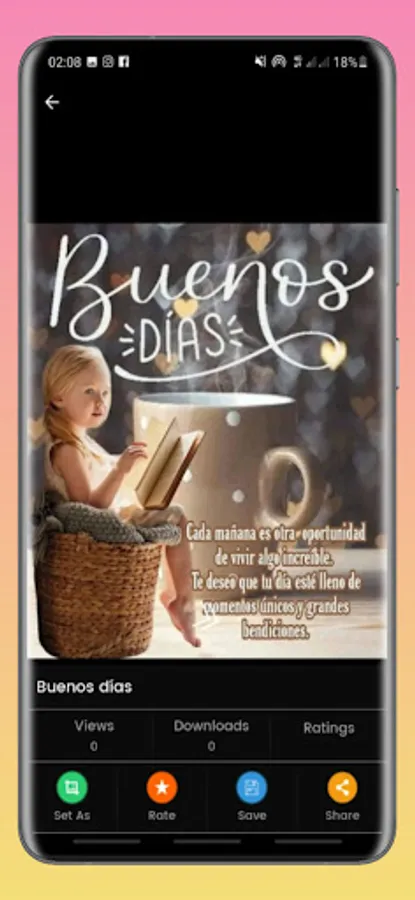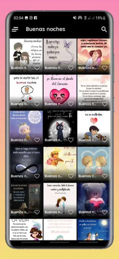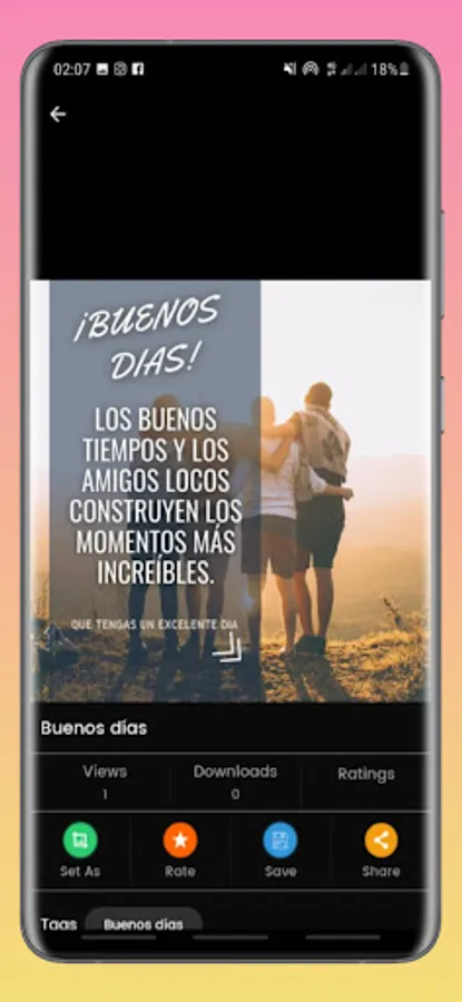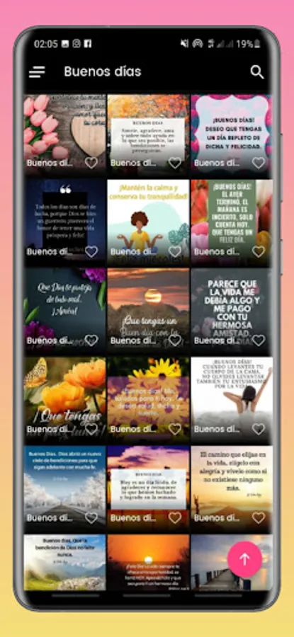 This application contains a gallery of selected images that everyone will undoubtedly like. "GOOD MORNING, AFTERNOON AND NIGHT" offers you a collection of phrases with beautiful cards or postcards that you can share daily at any time, divided into different categories: