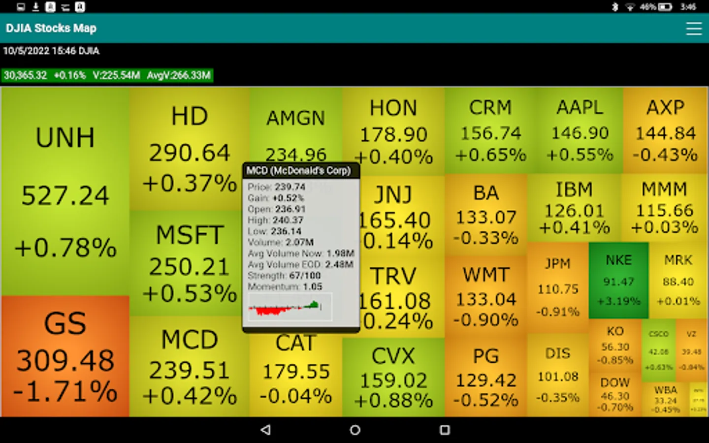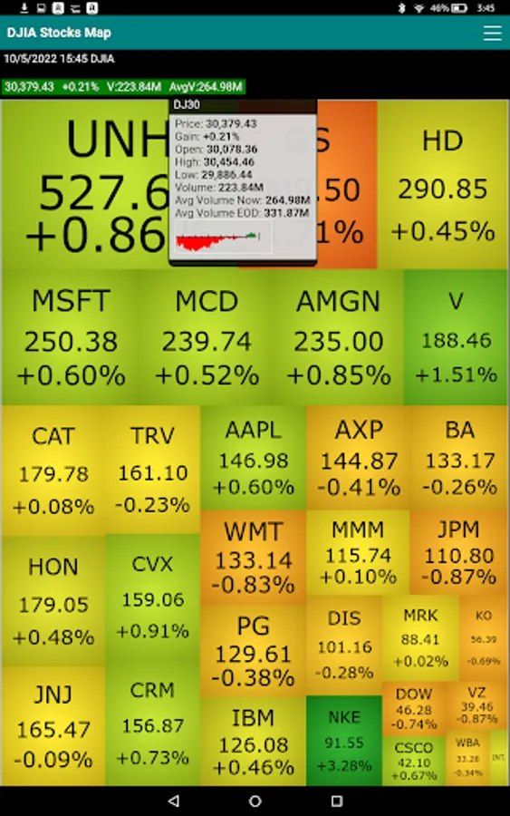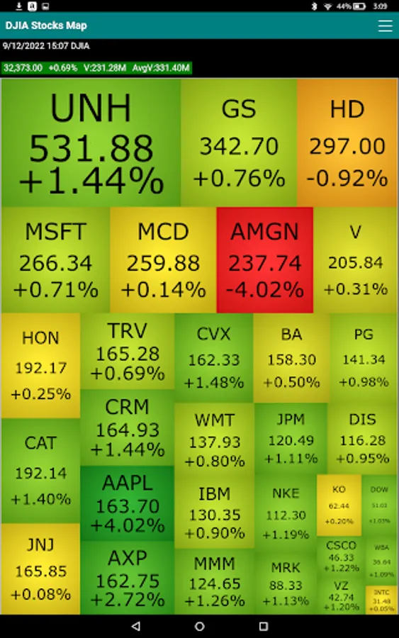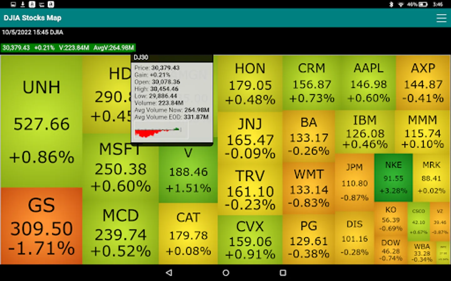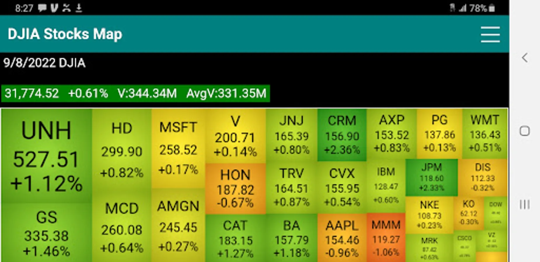 Stock Market Map (Heat Map a.k.a Tree Map) is a visual representation of stock market data. The size of each block represents the allocation of the stock within the entire composition. The color of each block represents gain or loss of the stock. The overall performance of the Dow Jones 30 components can be easily grasped by a glimpse to the map.