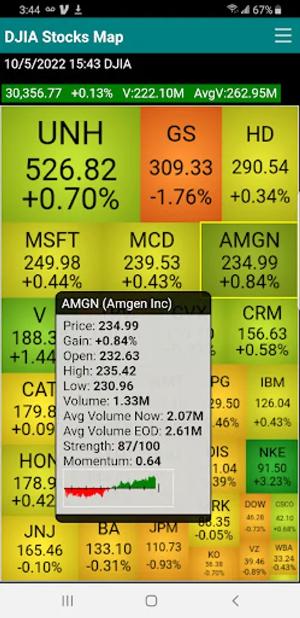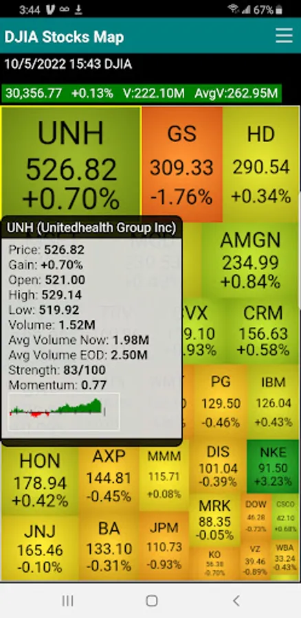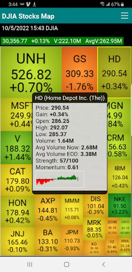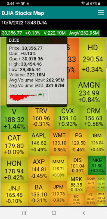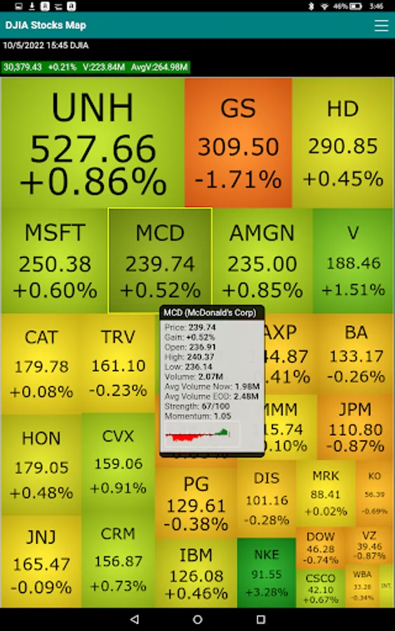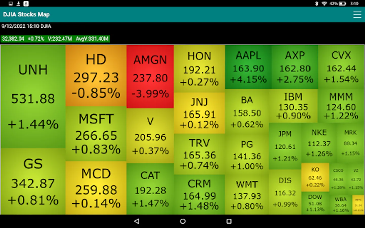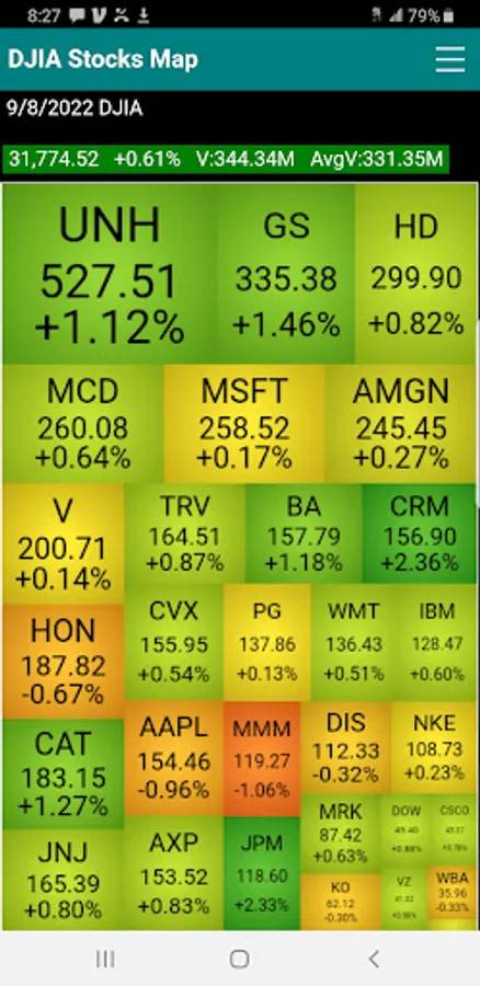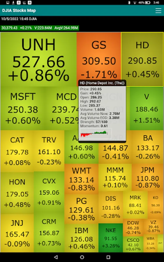 Stock Market Map (Heat Map a.k.a Tree Map) is a visual representation of stock market data. The size of each block represents the allocation of the stock within the entire composition. The color of each block represents gain or loss of the stock. The overall performance of the Dow Jones 30 components can be easily grasped by a glimpse to the map.