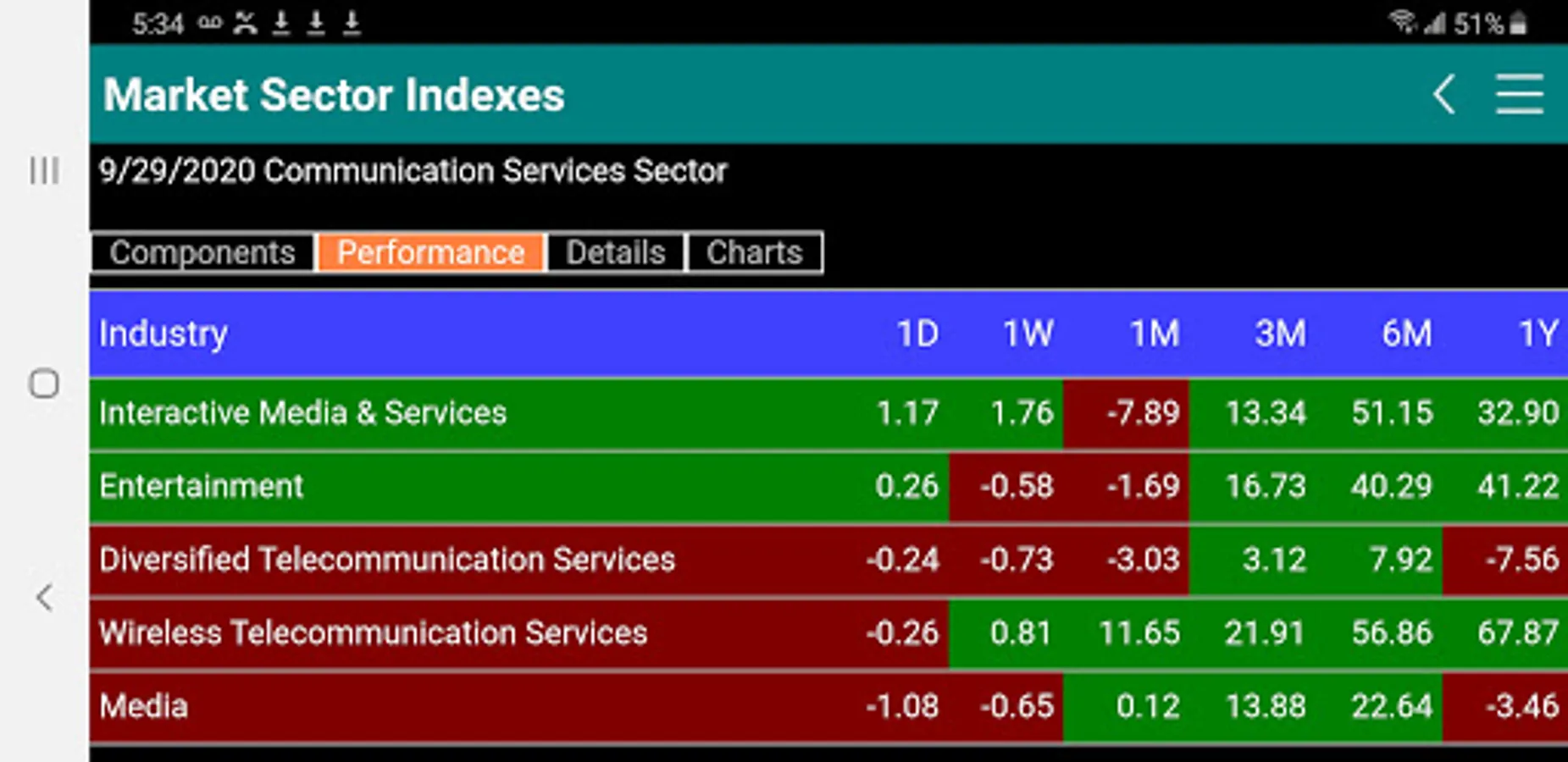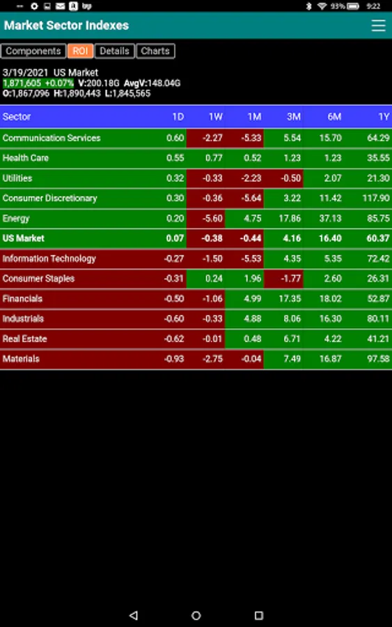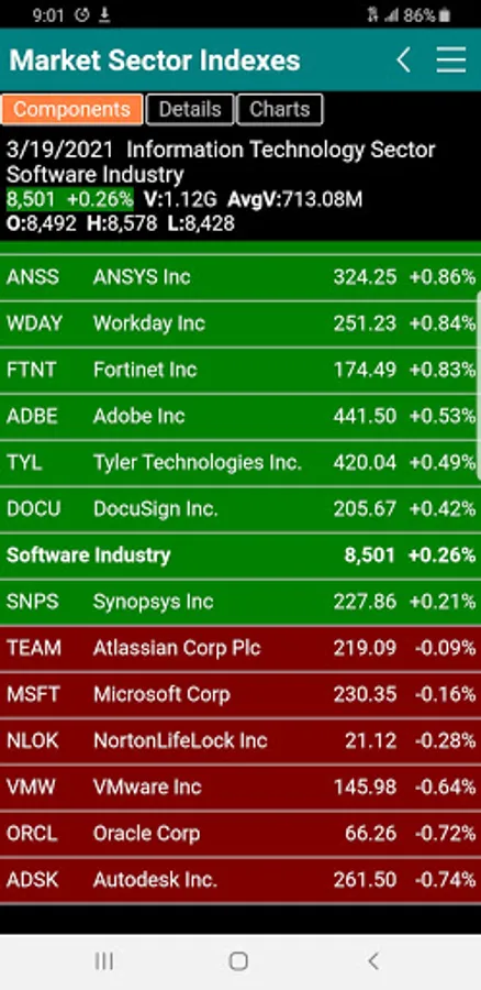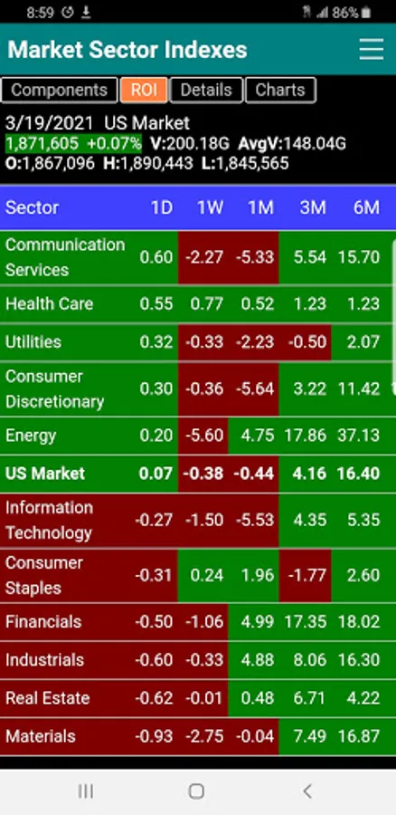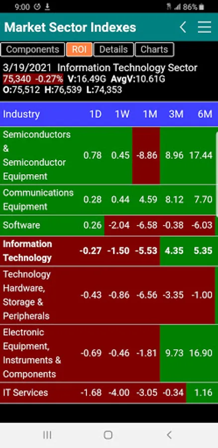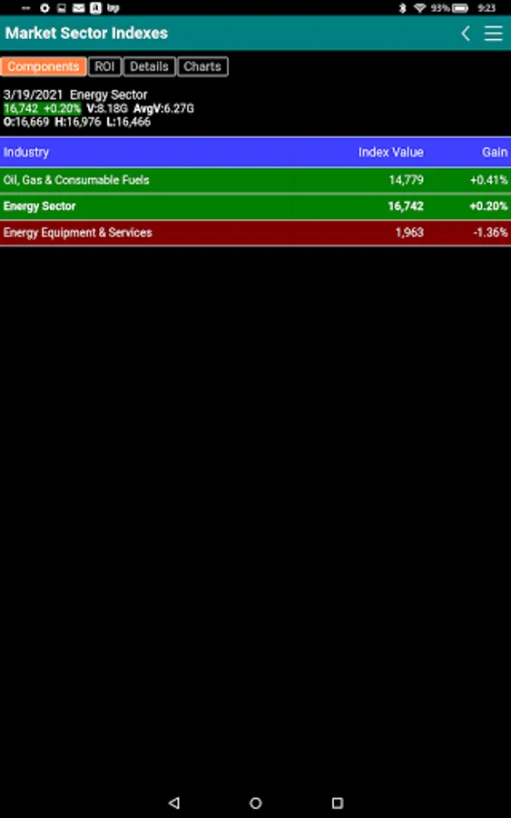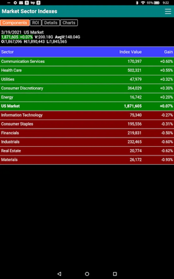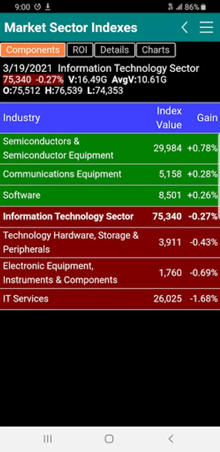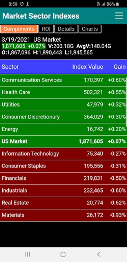 This app includes four types of information for each sector or industry index. The Components screen gives a list of underlying components of the index with prices and gains/losses. The Performance screen shows the list of components of the index with performance data from daily, weekly, monthly, 3-month, 6-month and one year periods. The Details screen gives specific information of each index, including the trading volume, the 52-week average volume, the allocation percentage of the industry within the sector, earning per share (ttm EPS) of the index and the Price to Earning (ttm P/E) of the index. The Graph screen gives the monthly, weekly and daily price chart of the index.