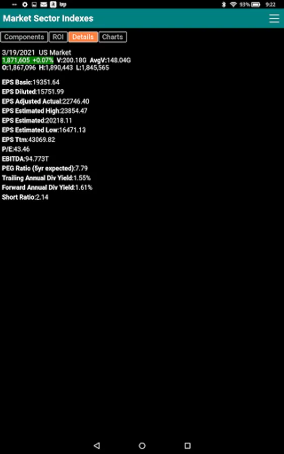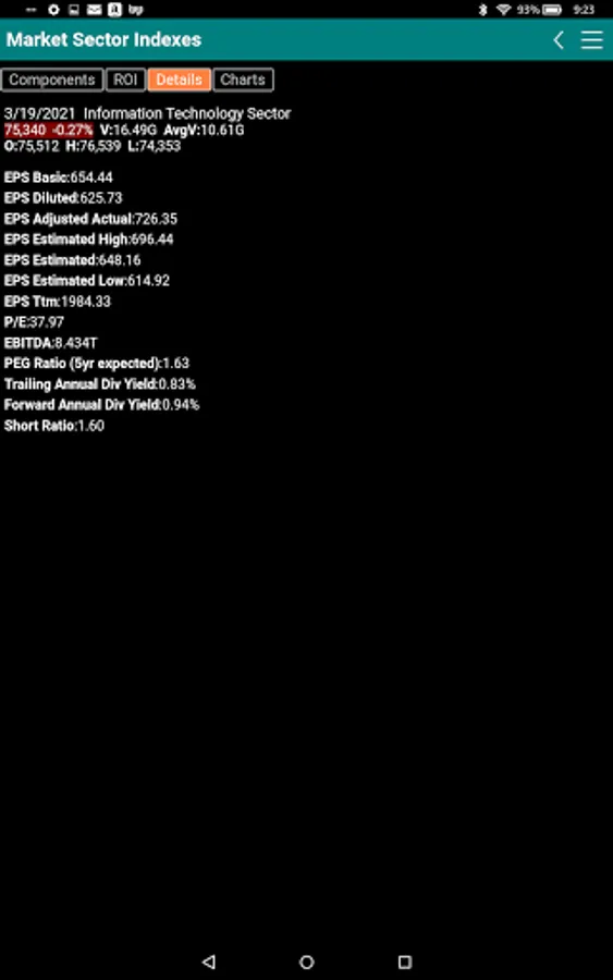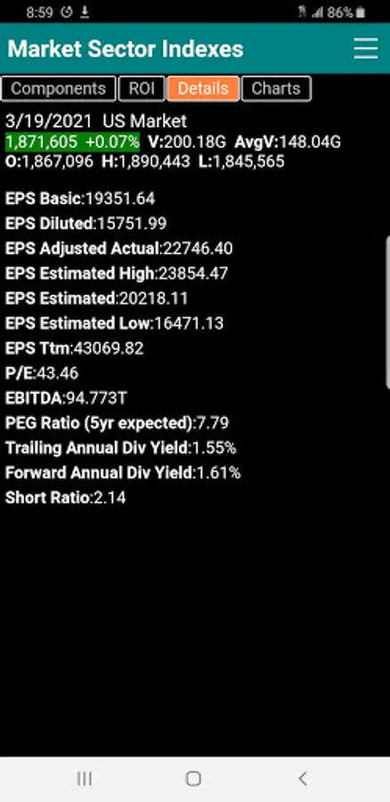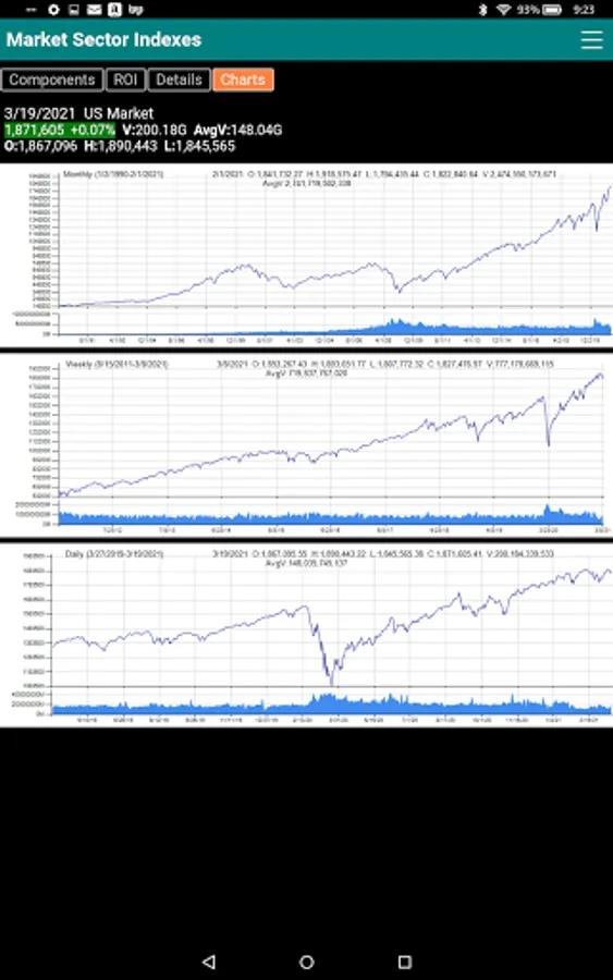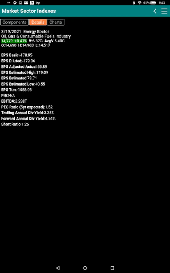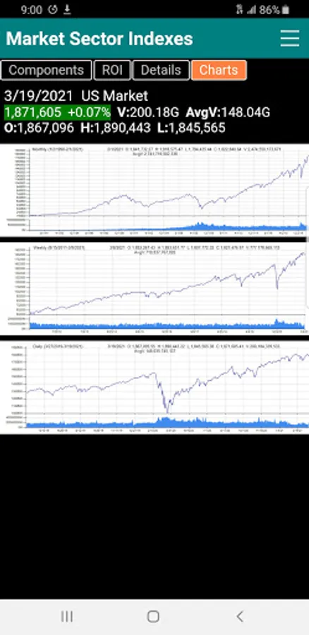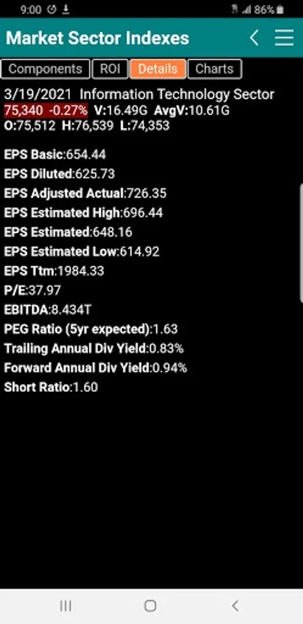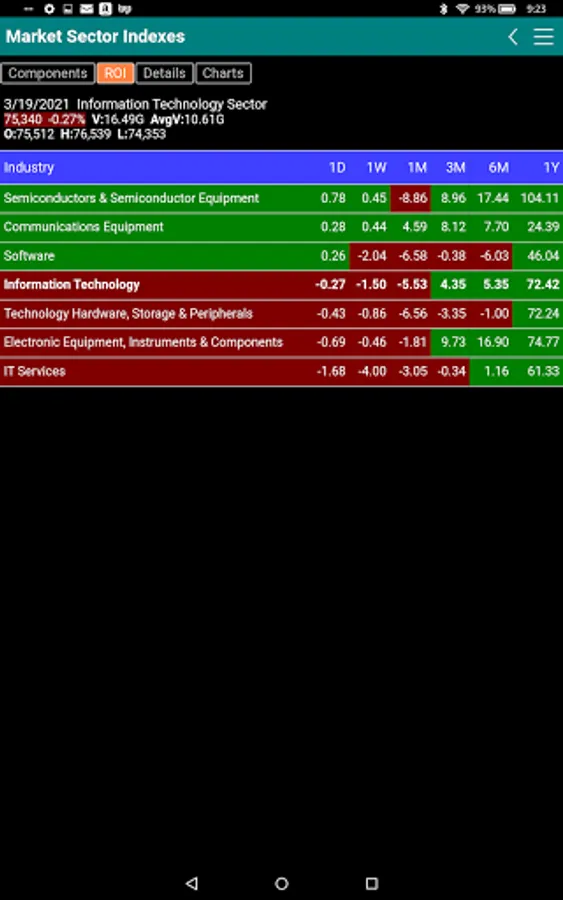 This app includes four types of information for each sector or industry index. The Components screen gives a list of underlying components of the index with prices and gains/losses. The Performance screen shows the list of components of the index with performance data from daily, weekly, monthly, 3-month, 6-month and one year periods. The Details screen gives specific information of each index, including the trading volume, the 52-week average volume, the allocation percentage of the industry within the sector, earning per share (ttm EPS) of the index and the Price to Earning (ttm P/E) of the index. The Graph screen gives the monthly, weekly and daily price chart of the index.