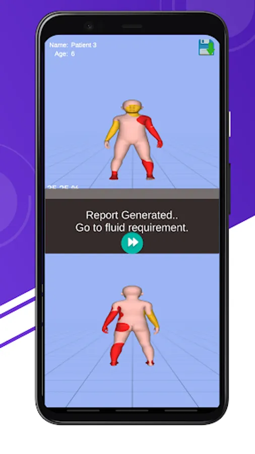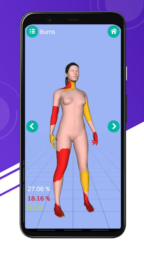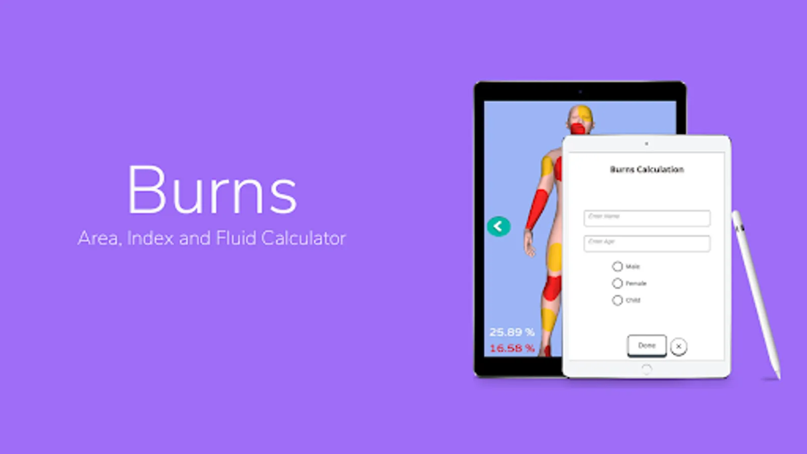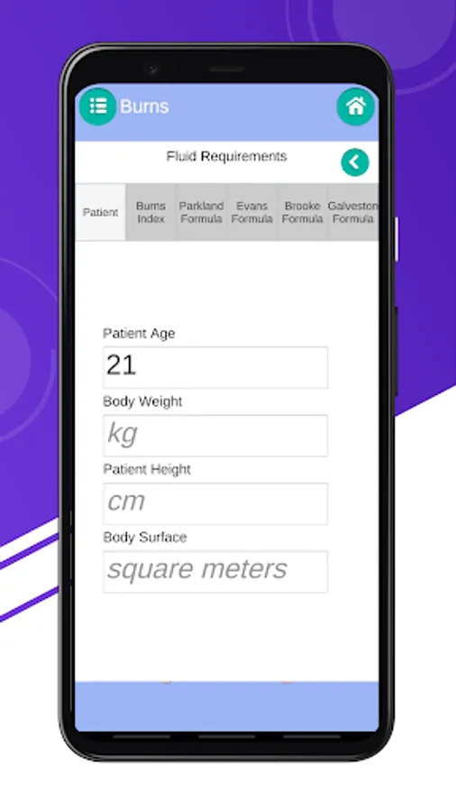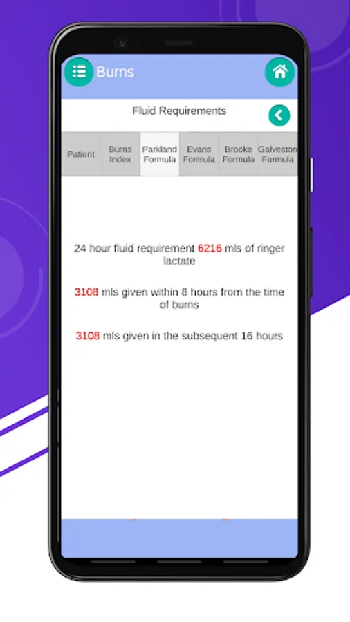 The burn resuscitation fluid in this application is calculated by using both the Parkland formula and Brooke formula, Evans formula is the standard burn care formula that accounts for body weight and the burn surface area. The nutritional requirement has been calculated from the Galveston formula.