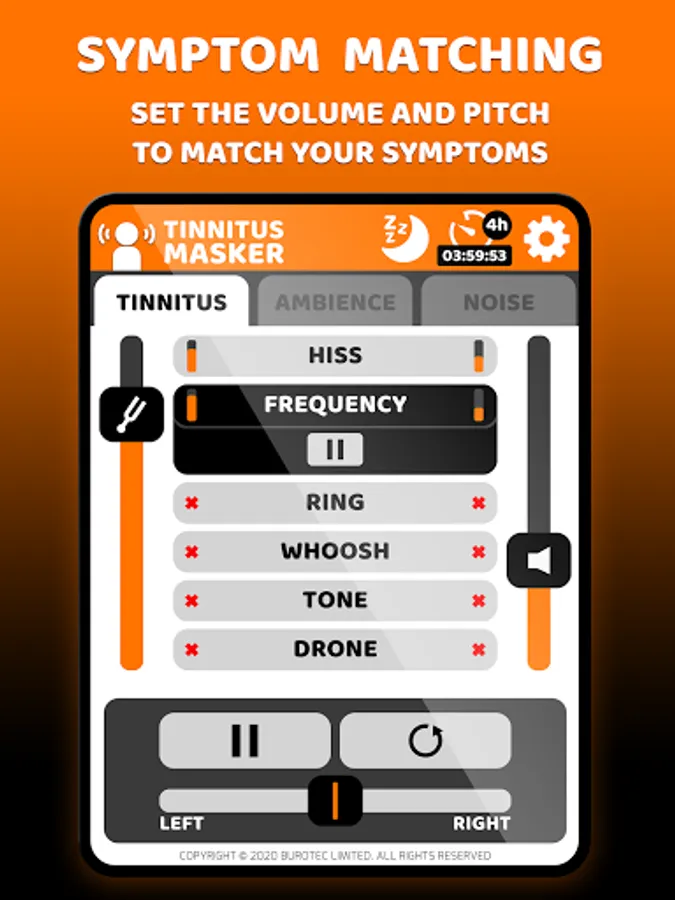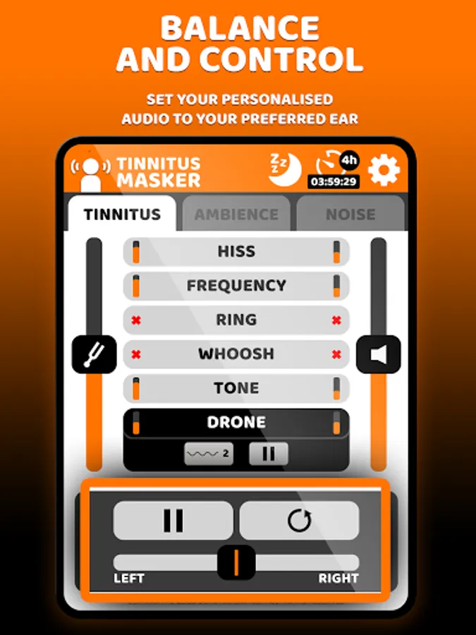Fine tune your tinnitus symptomatic sounds such as ringing, hissing, high-frequencies, tones and drones for your own custom tinnitus relief experience.