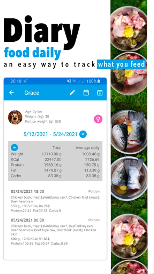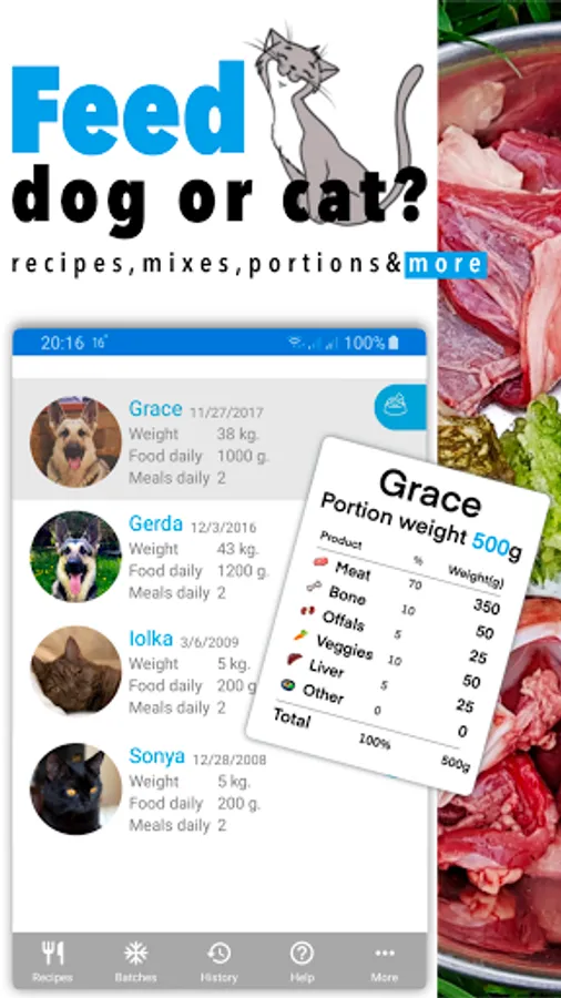 - add your pets and enter, how much you plan to feed them per meal ( in gramms/oz or in percent of dog weight )