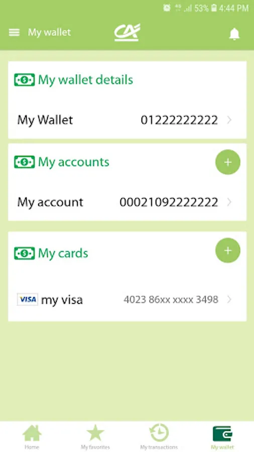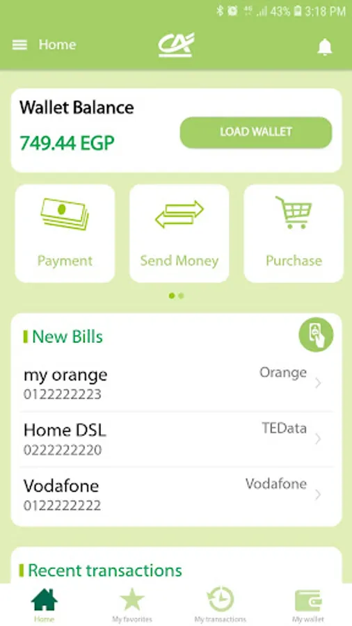 - Load your wallet from Crédit Agricole Card or account or recharge by making deposits through Fawry agents
