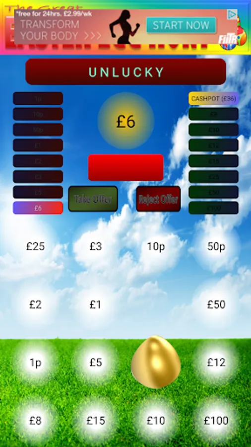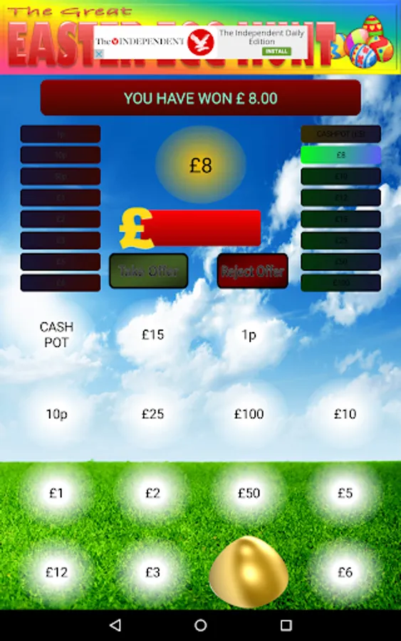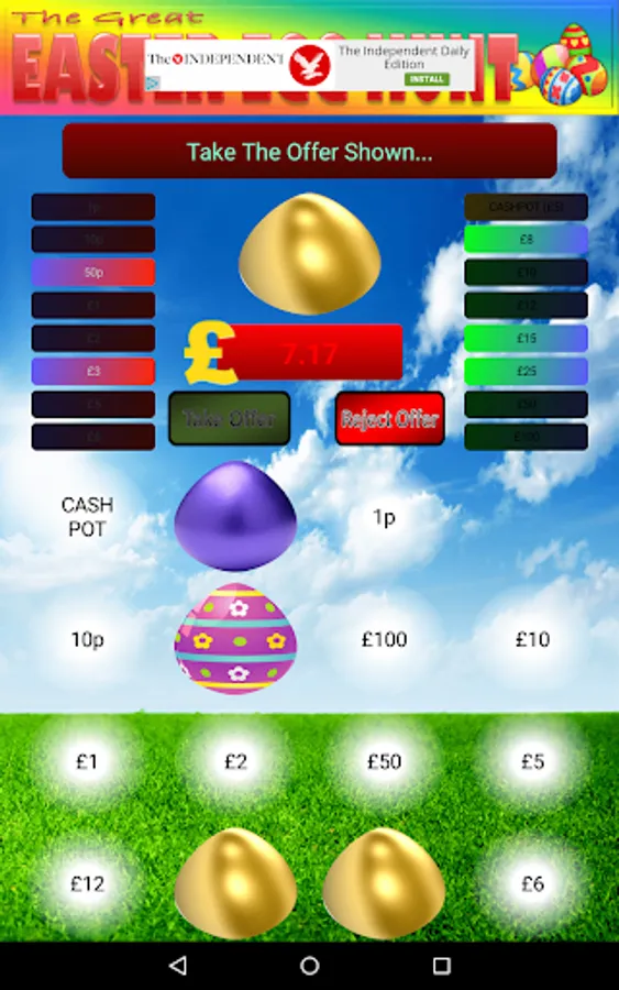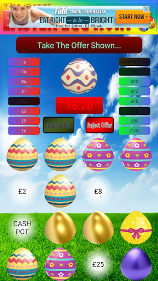 Now select other eggs to reveal and eliminate their hidden cash values. At regular intervals an offer will be made for your egg, based on the number of eggs and the hidden values remaining. At which point you have to decide whether to Deal / Take offer, or No Deal / Reject the offer.