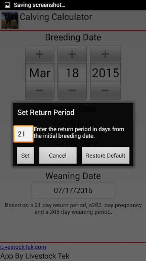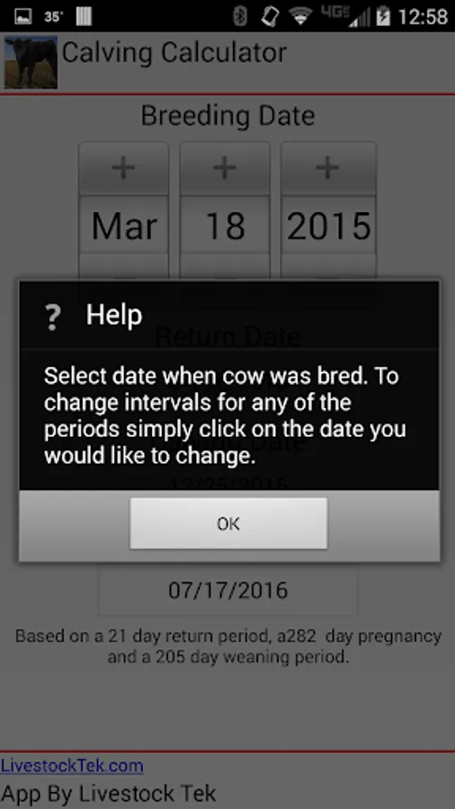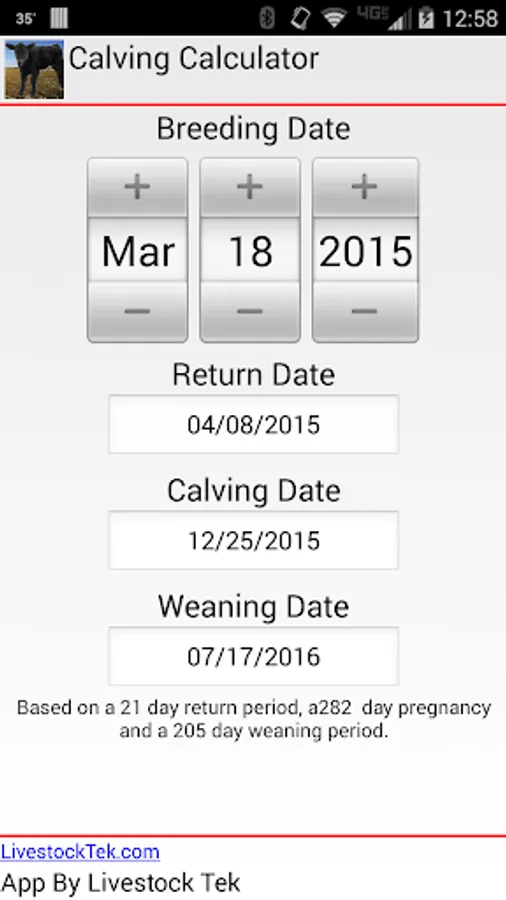 Easily calculate gestation cycle of beef cattle. This app calculates the return date, the calving date, and the weaning date based upon the observed breeding date. Fast and Easy to use and read. A must have for any farmer or rancher. The app also allows the user to change the amount of days in the three periods to best match your cow herd.