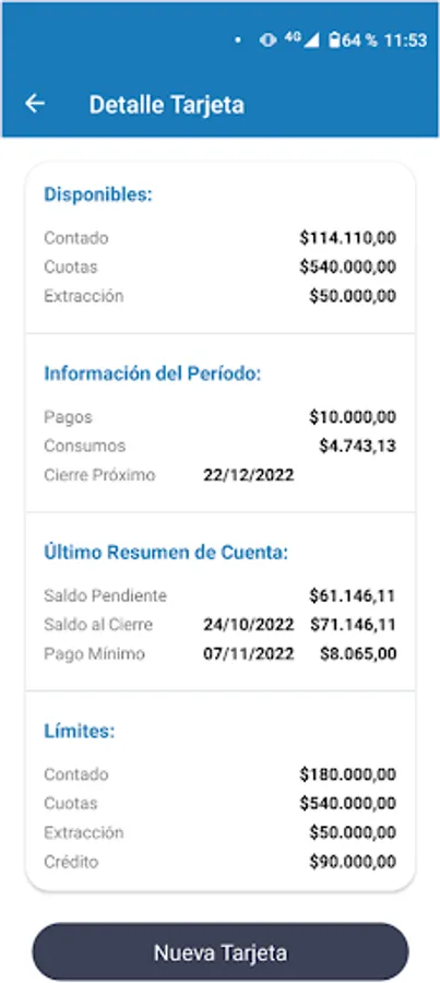Without the need to call or approach your entity, you will know the payments made during the current month, you want to know the status of your account, do not wait for the end of the month. Infotarjetas allows you to know the consumptions made so far and if you want to manage your account well, it tells you when your card is due to close, so you can manage your resources well.