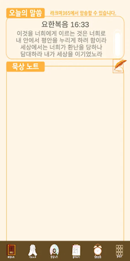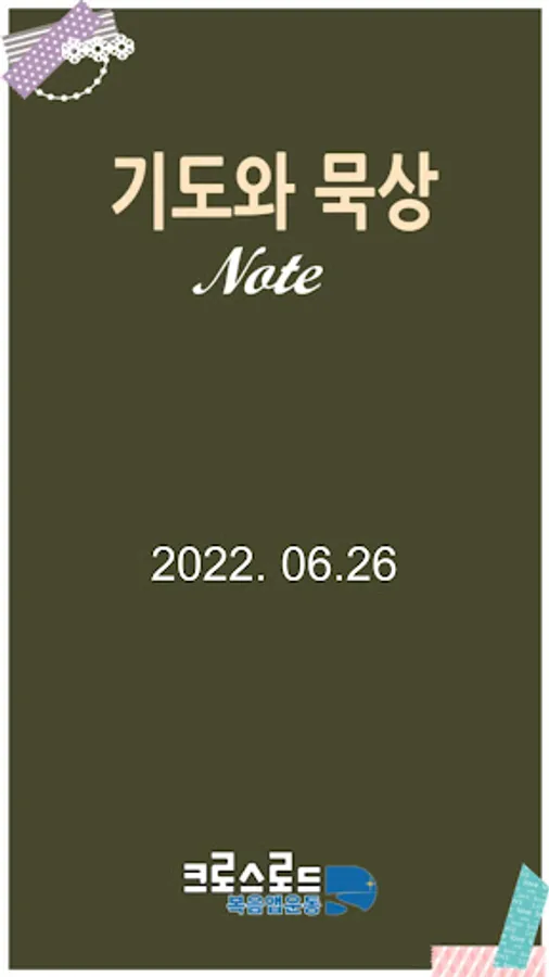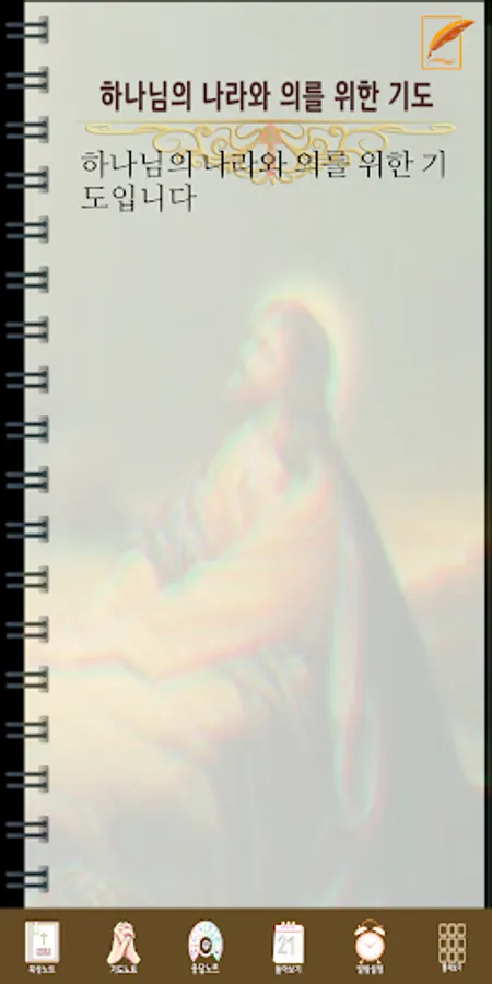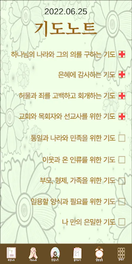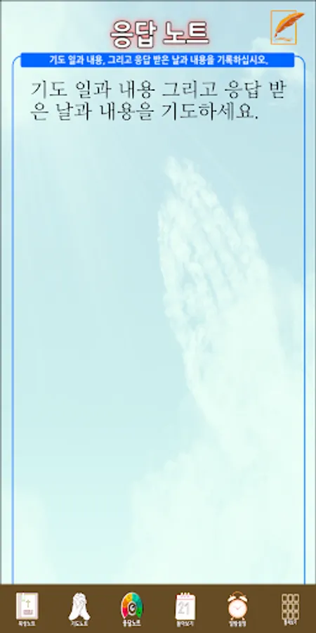 4. To move from the meditation note to the prayer note, click the prayer note icon among the icons placed at the bottom to select “My Prayer” and “Prayer Subject”, and click My Prayer to go to the page where you can write a prayer If you select the prayer topic, 9 prayer topics are displayed, and if you click the prayer topic, you can write the corresponding prayer. The input method is the same as the contemplative study. To move to another prayer topic, swipe the left and right edges of the screen, or click the prayer note icon at the bottom to go back to the prayer selection. In the prayer subject view, a red cross is displayed on the right of the subject in which the prayer was entered.