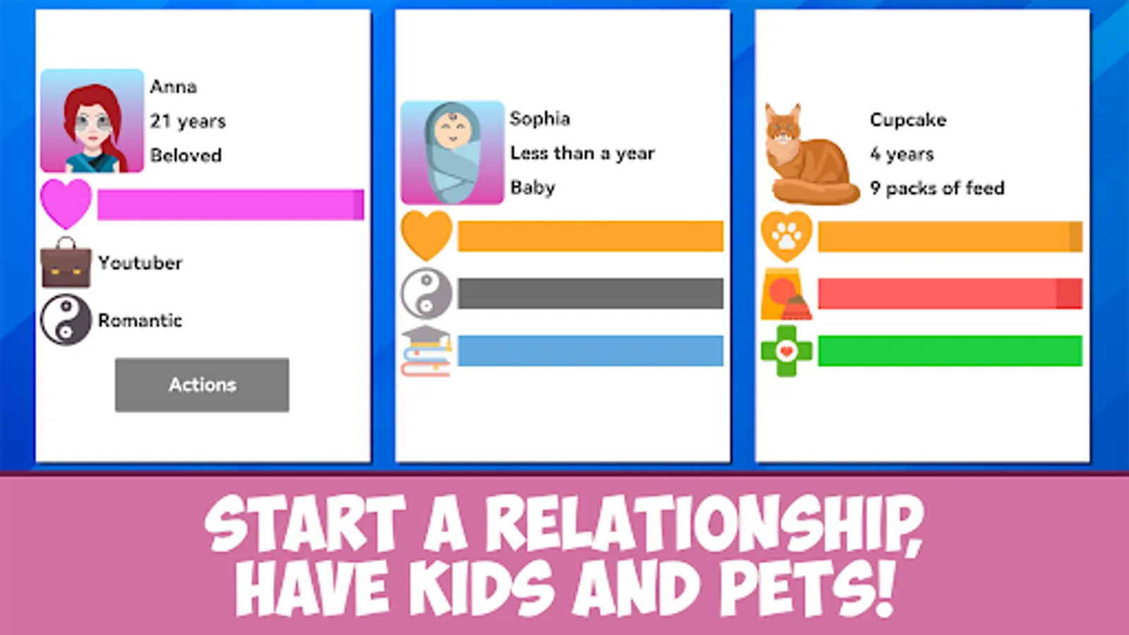- There is a simulation of life: your character grows up, starts relationships, goes on dates, has children and pets from a variety of choices and breeds!
