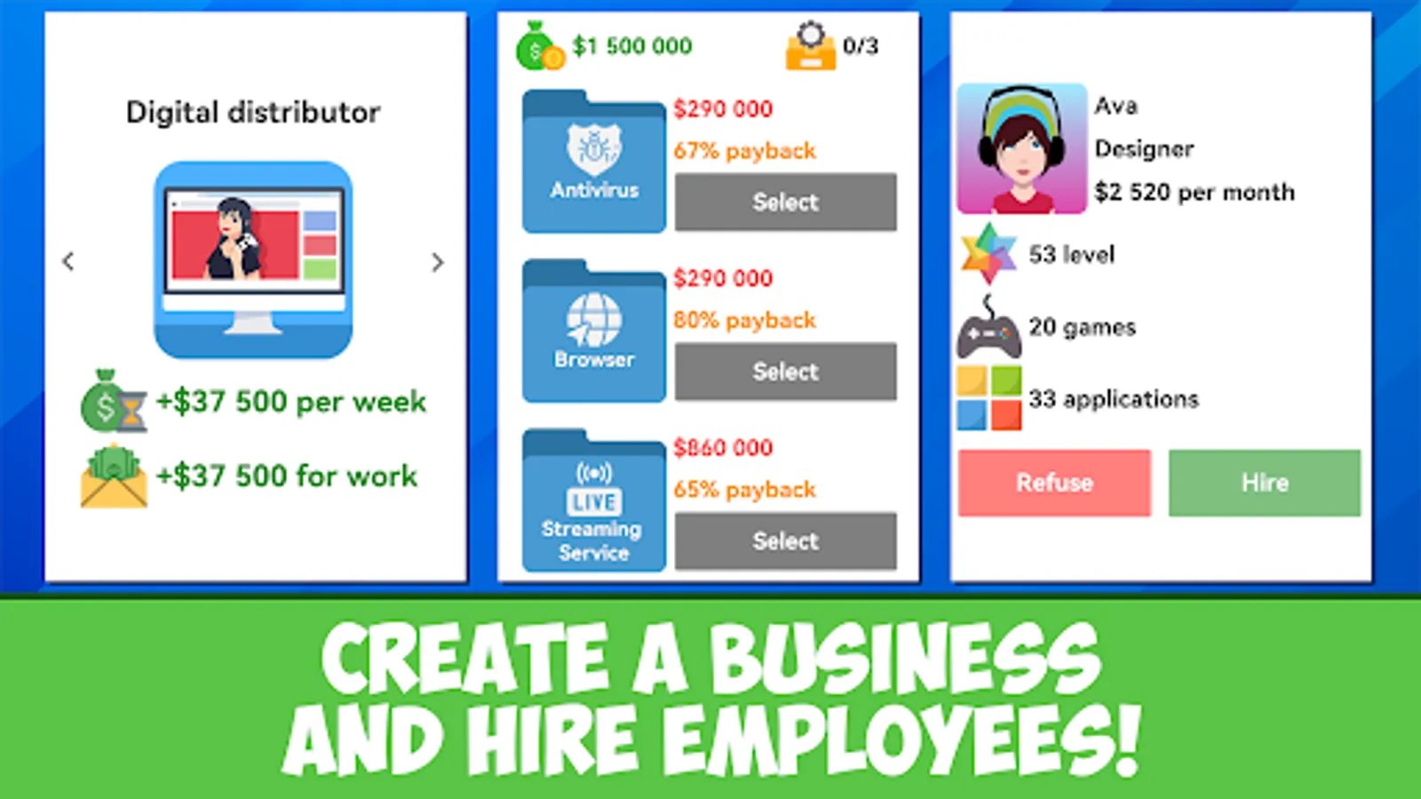 - Create your own business empire: the opportunity to buy various types of businesses (from gaming sites to digital publishing and corporations), expand from several stages, hire more than 1800 different employees in your game studio, invest in projects and much, much more!