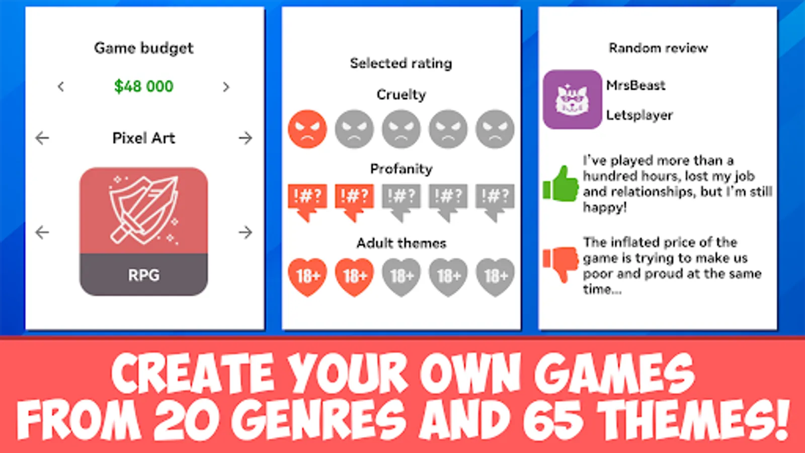 - There is a detailed simulation of game creation: a variety of game genres, a huge number of themes, platforms (PCs, consoles, smartphones), various graphics styles, a choice of game engines, flexible rating settings (adult themes, profanity, cruelty), a choice of actors for motion capture and voice acting, many countries for localization and much, much more other!