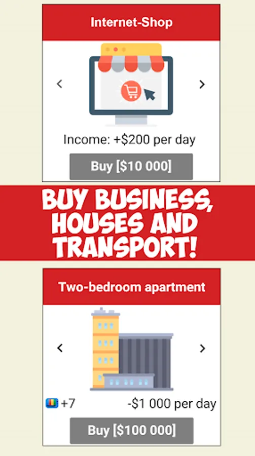 – BUY houses and transport to improve your own life. The better your property and transport, the better your character feels.