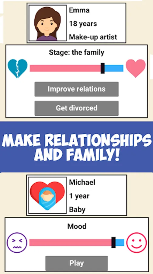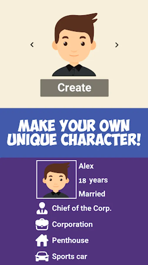 - CREATE your own unique character, make him look like you: choose name, age, gender and appearence. Remember, your character is constantly growing old!