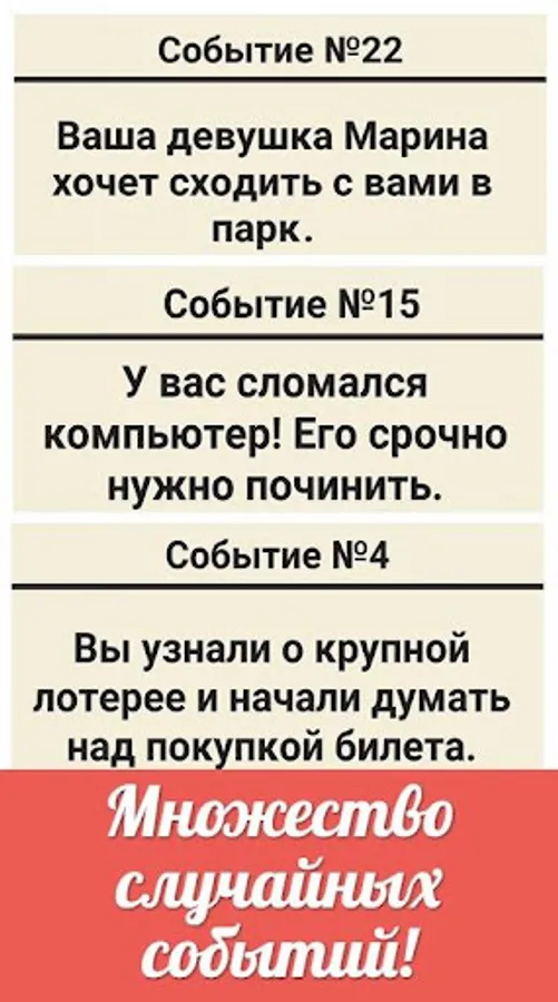 - Random events: you can go to the store and lose some of the money, either on the way a robber will attack you, or you will find money. These are just some variants of one event, and a great many events!