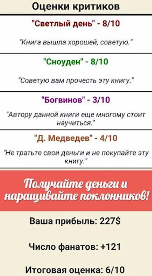 - Ability to write books of your dreams: you define the name, genre, design, writing. Each of your books will be evaluated by the best critics, on whose ratings sales and income of your book depend.