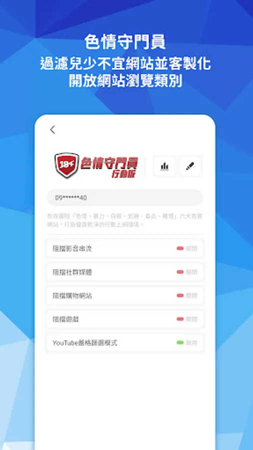 Reminder: This application is provided for Chunghwa Telecom users who have applied for HiNet Porn Goalkeeper, HiNet Internet Time Management, HiNet Anti-Hack Goalkeeper, Porn Goalkeeper Mobile Version, Internet Time Management Pro Mobile Version, and Anti-Hack Goalkeeper Mobile Version.