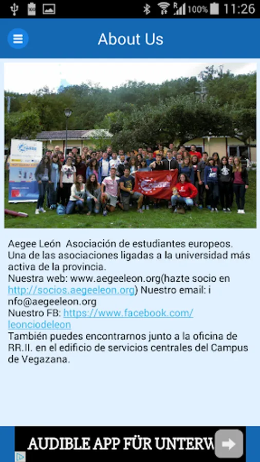 AEGEE León, integrada en la asociación interdisciplinar de estudiantes más grande de toda Europa y con aproximadamente 100 miembros en León (España) y casi 15.000 en todo el continente pone a tu disposición esta App para que puedas estar al tanto de todas nuestras actividades locales, noticias, reuniones, fiestas, los eventos más importantes a nuestro alrededor... Una forma única de estar al día de todo lo que hacemos. Si eres socios podrás unirte a ellas y no aburrirte un solo día.