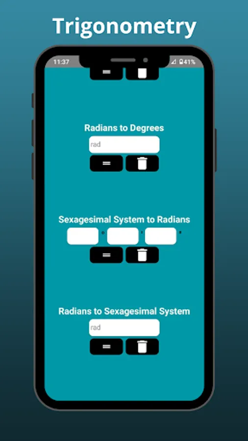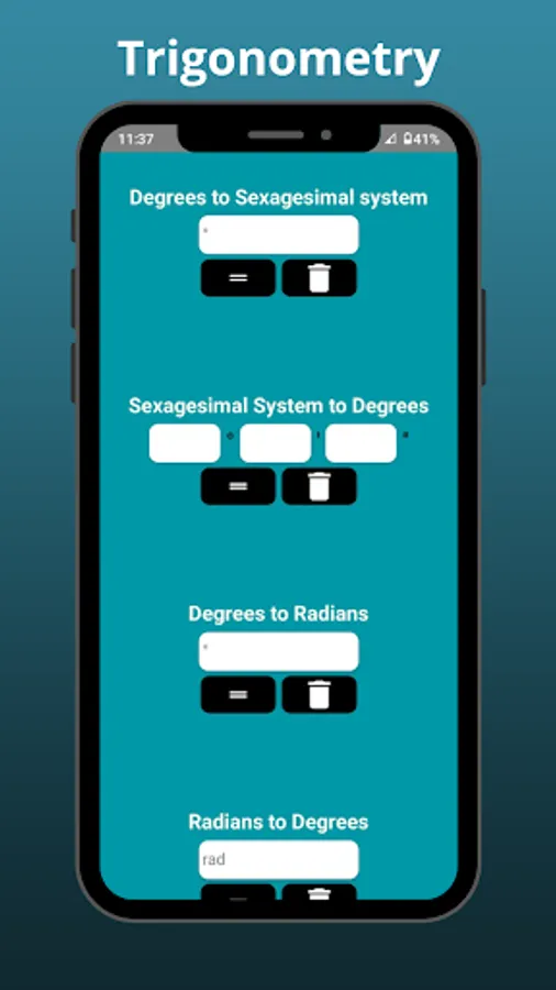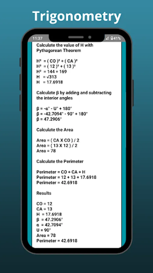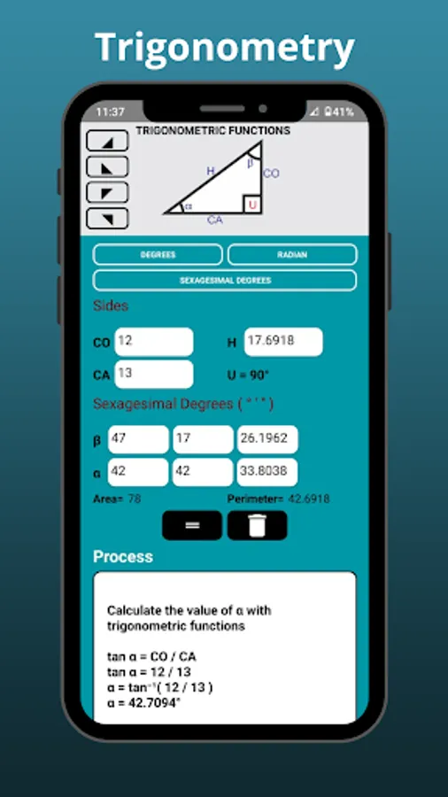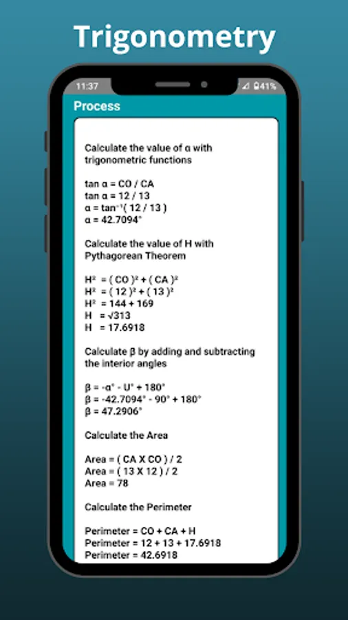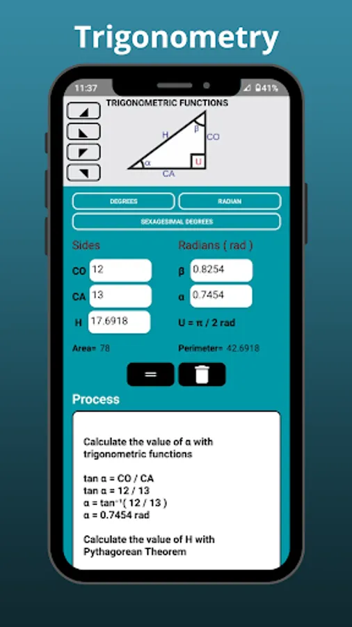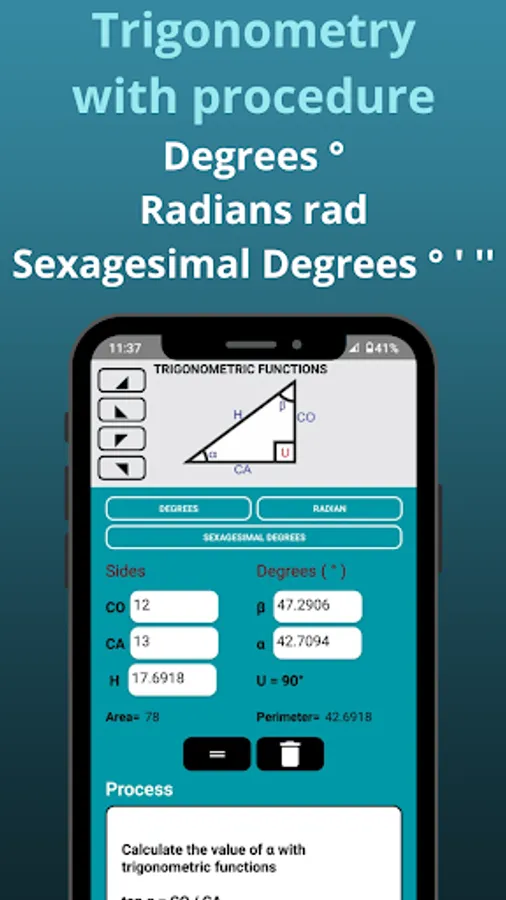This application calculates the sides and angles of a right triangle showing the PROCEDURE with different units: