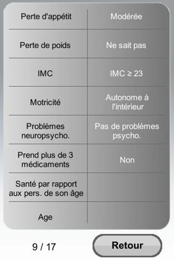 According to data from the original publications, it allows for individual patients concerned progressive increments automatically calculate answers to get the individual score and then decide if the evaluation is warranted or not the patient.