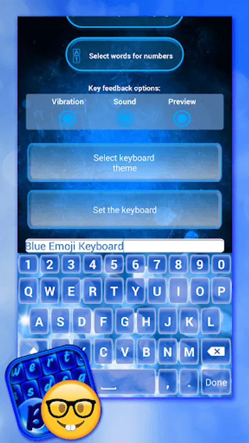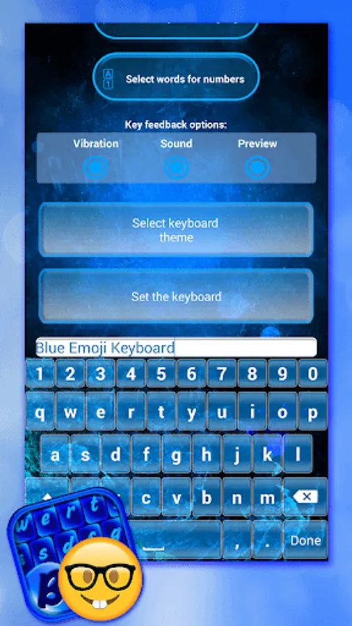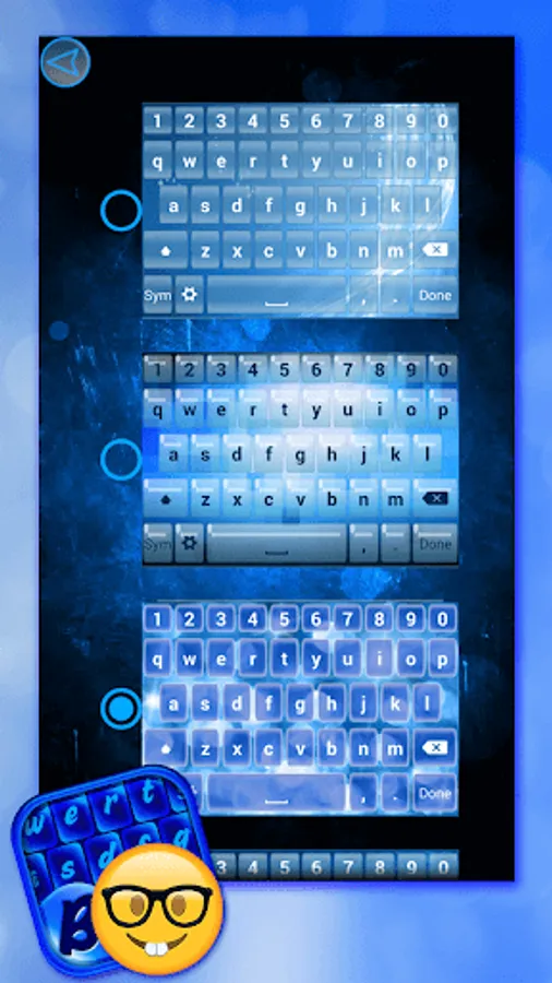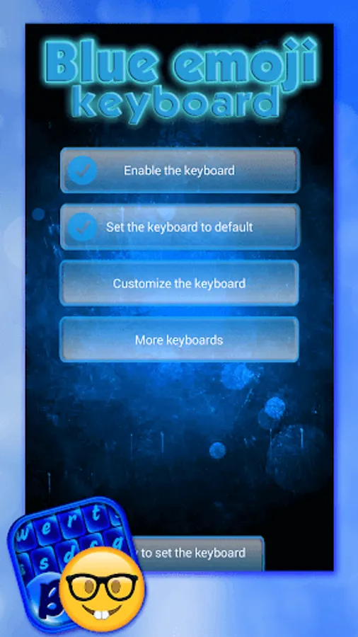 Need blue “keyboards for Android”? Install for free Blue Emoji Keyboard Themes and send fancy emojis and smiley text faces via SMS or social networks. Fast type with this smart keyboard with emoji faces. Download blue picture keyboard themes and marvel at the timeless beauty of your perfect keyboard wallpaper! Looking for a touch keyboard full of sweetness that would give your smartphone a stylish and sophisticated look? Forget about your old “keyboard cover”! If you like funny smiley faces you'll adore our fancy keyboard emoticons! This “blue keyboard” offers an astonishing variety of awesome backgrounds for your phone keyboard which are certain to give an entirely new dimension to the monotonous process of typing and sending text messages!