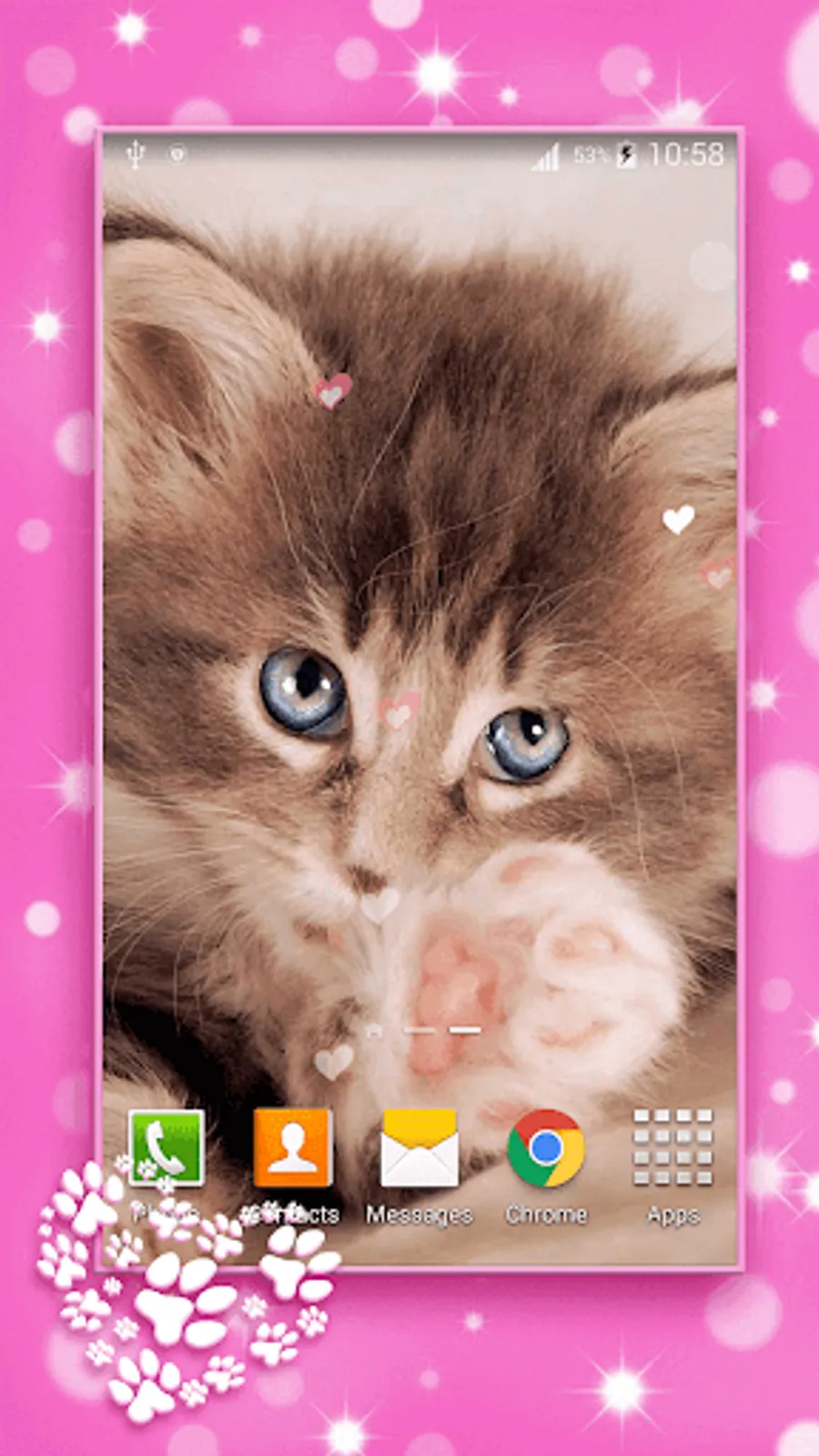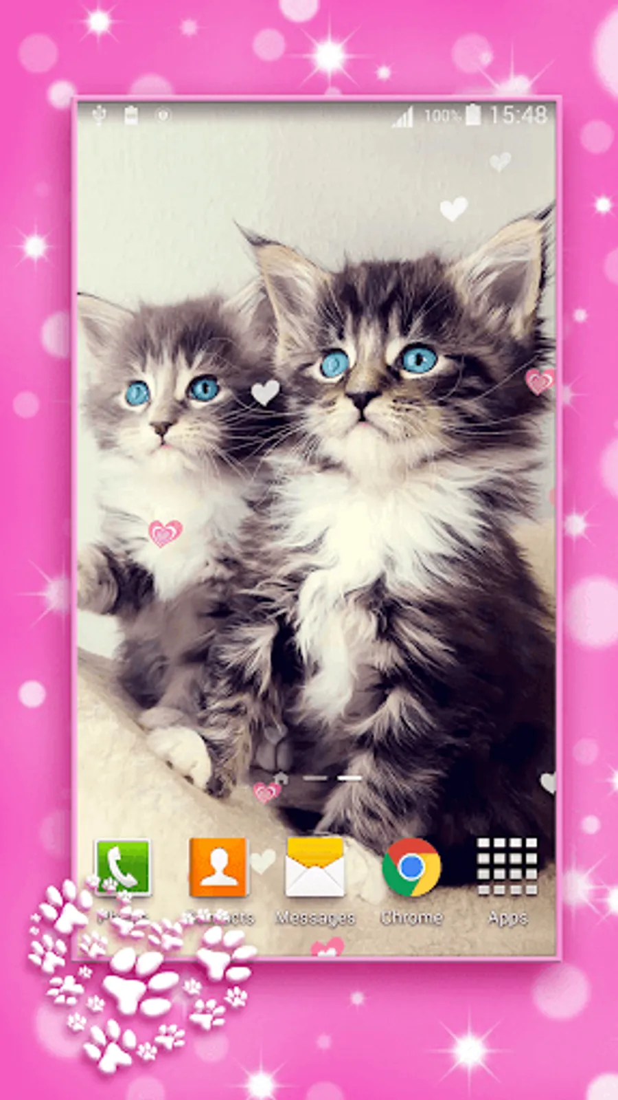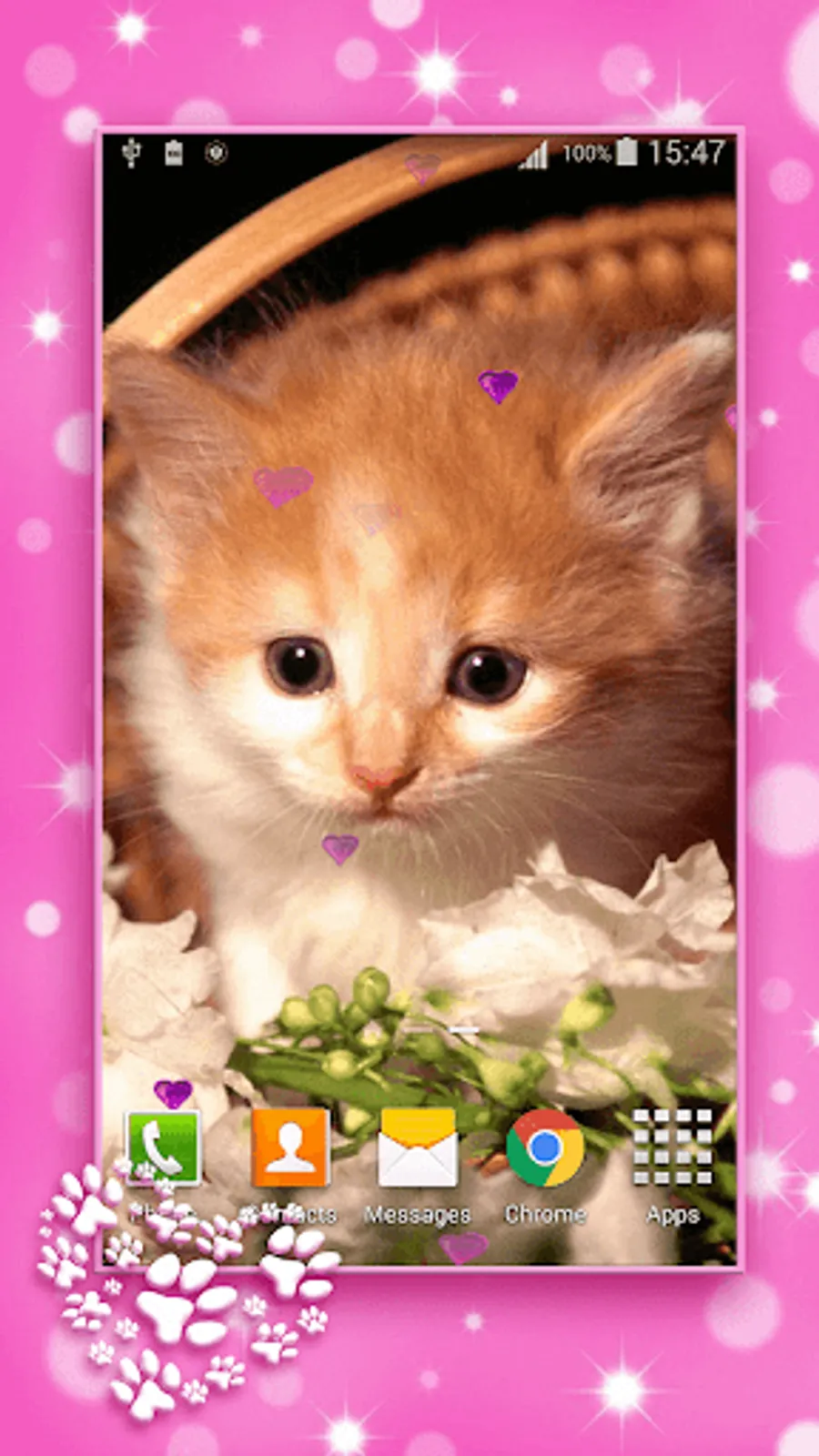 Meow, meow, kitty cat! Cat lovers only! If you prefer cats more than dogs, get this Cute Kittens Live Wallpaper, the best animated backgrounds free download. Watch your full screen “baby kittens” everyday until they become your favorite pets. Having a cute cat virtual pet on your mobile background is a daydream for every cat lover. Click on cute kitten wallpaper free download and get amazing sight of free kitten cat images hd. Sweet “cats wallpaper” will look great on your phone and tablet device. Mesmerizing sight of adorable cute baby animals will fill your heart with joy. Do you have one so cute cat pet at home? Get a bunch of sweet kittens on your display and find yourself surrounded with cute cats pictures. Welcome the cat world on our home screen. These free animated wallpaper backgrounds with cats and falling particles like paws and sparks will create a wonderful atmosphere on your mobile wallpaper.