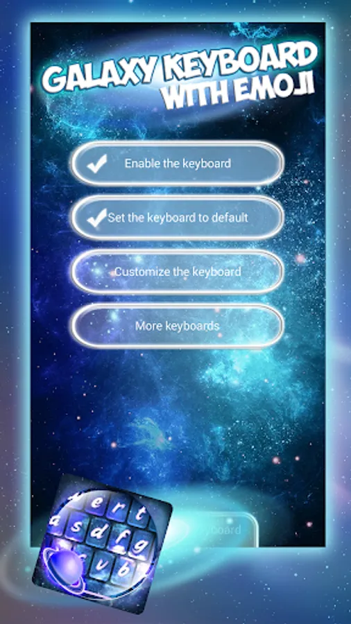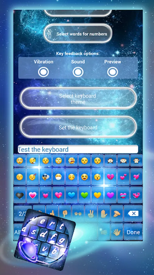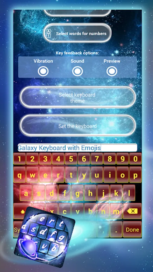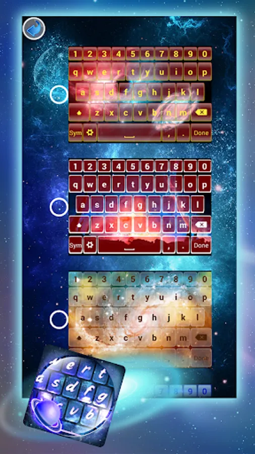 Ready for typing from the outer space? Download Galaxy Keyboard with Emojis free of charge that will take you to the Moon and back! Try out “galaxy emoji keyboard” and make your own keyboard in your own style. Go on a galaxy trip every time you type text messages. We made the best “galaxy emoji” keyboard themes for all space lovers. Color your keyboard with neon color, crystal dust, stars, constellation and get this free “galactic keyboard themes”! Pass the space line, by setting these “galaxy keyboards”! Enter the galaxy world and enjoy this “luminous keyboard”! Prepare for the galactic attack! Change your old mobile keyboard with “galactica keyboard changer”! The best “galaxy apps” are here to decorate your plain keyboard. Hurry up and take the most beautiful “galaxy photo keyboard” among all!