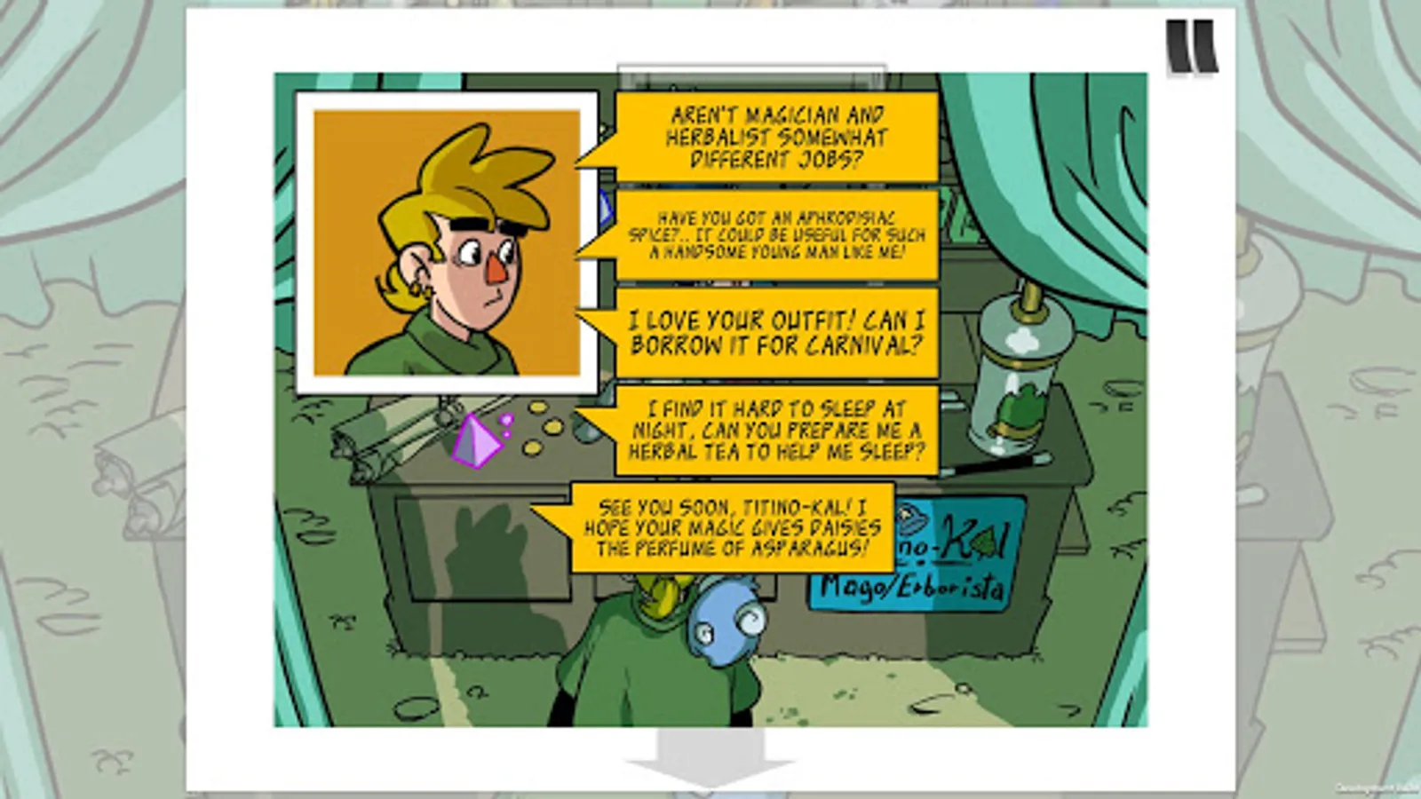 - Read the dialogues carefully and look for clues to help you solve the puzzles, presented in the style of a comic book