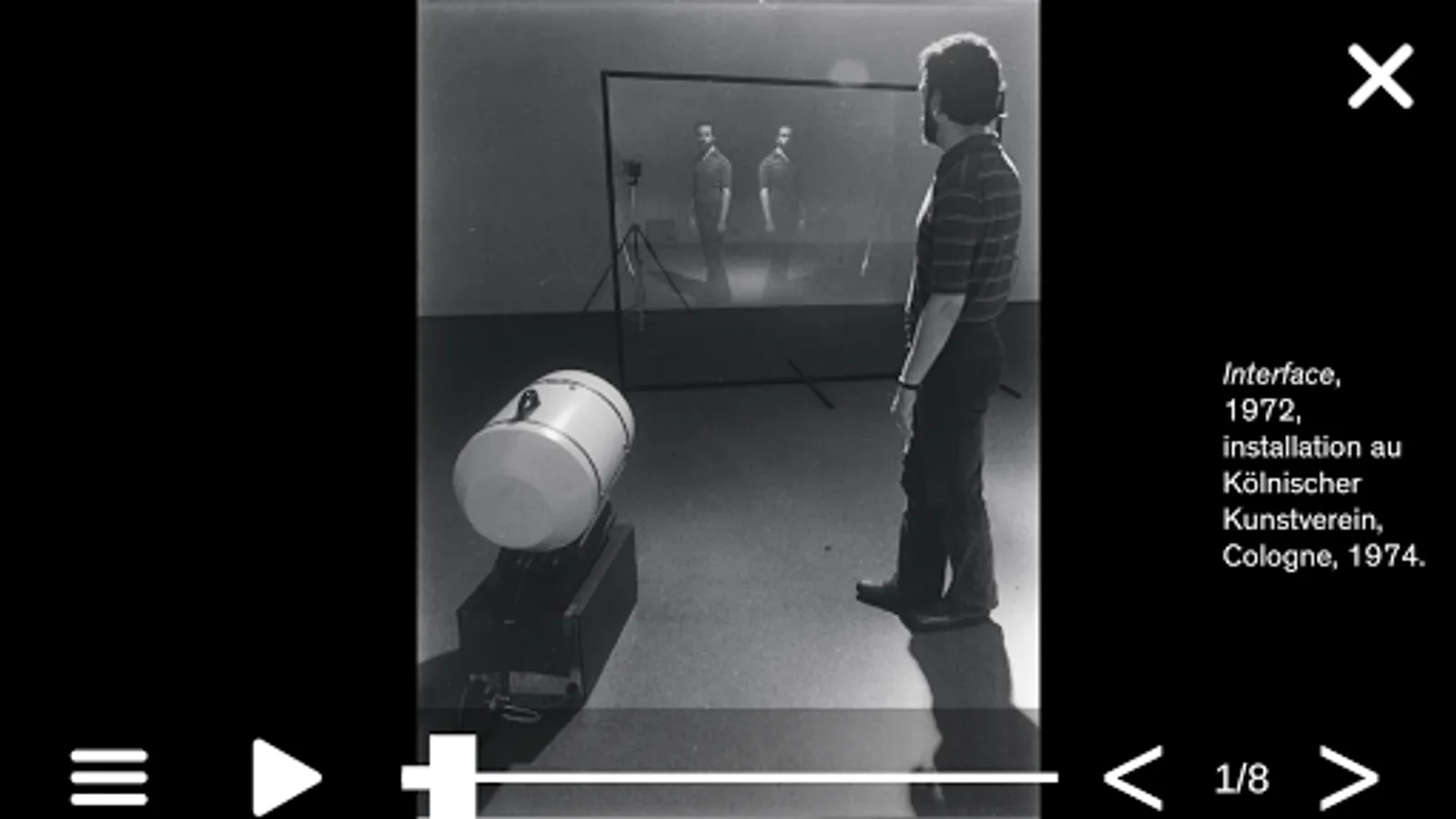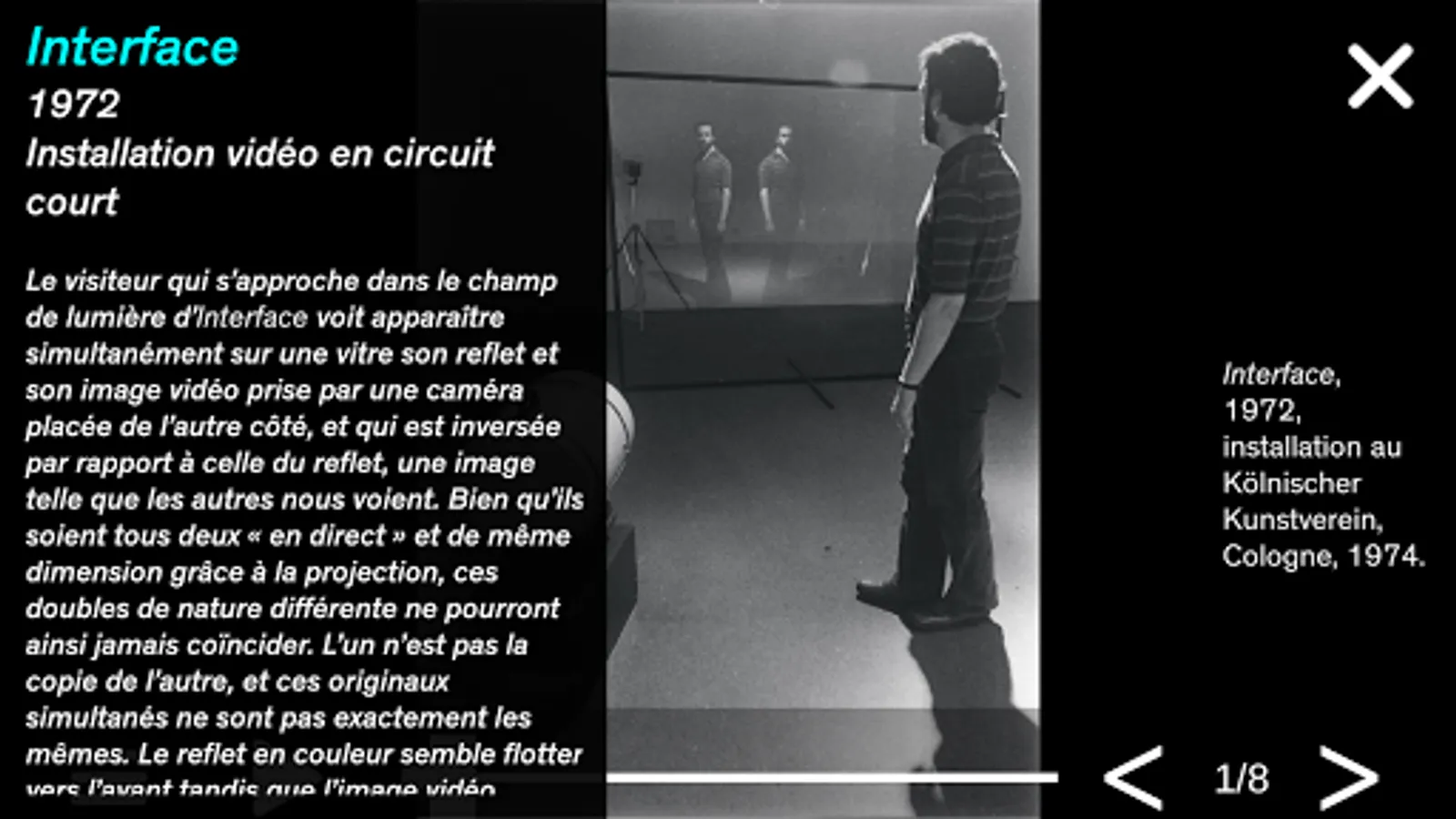 After downloading, launch the application and follow the instructions on the screen in the « user’s manual » part to explore the database of Peter Campus’s works.