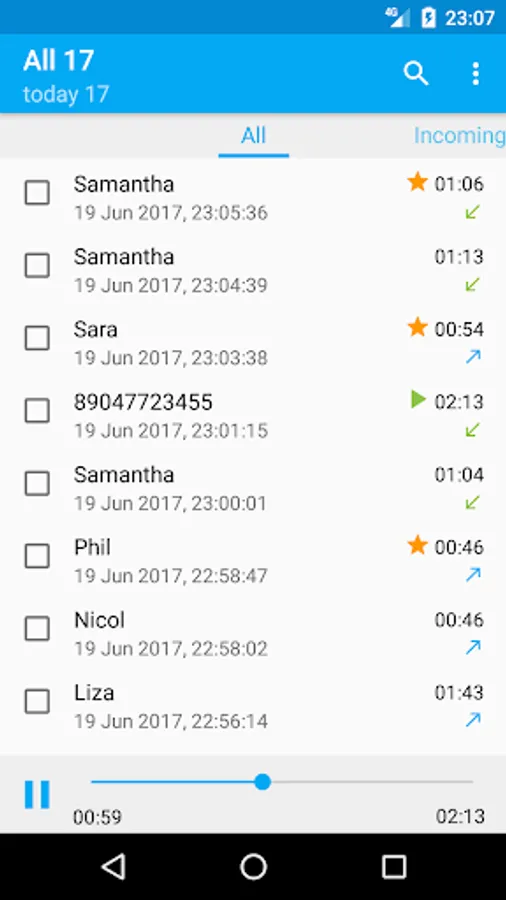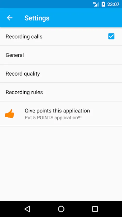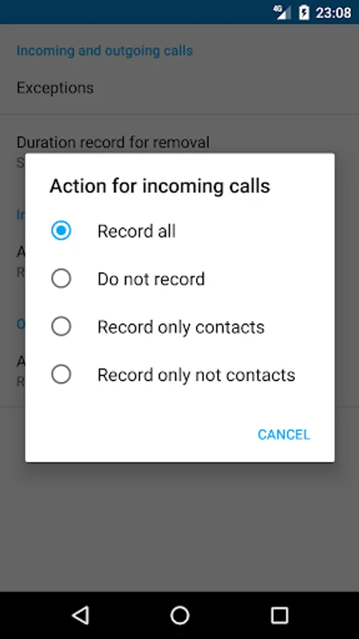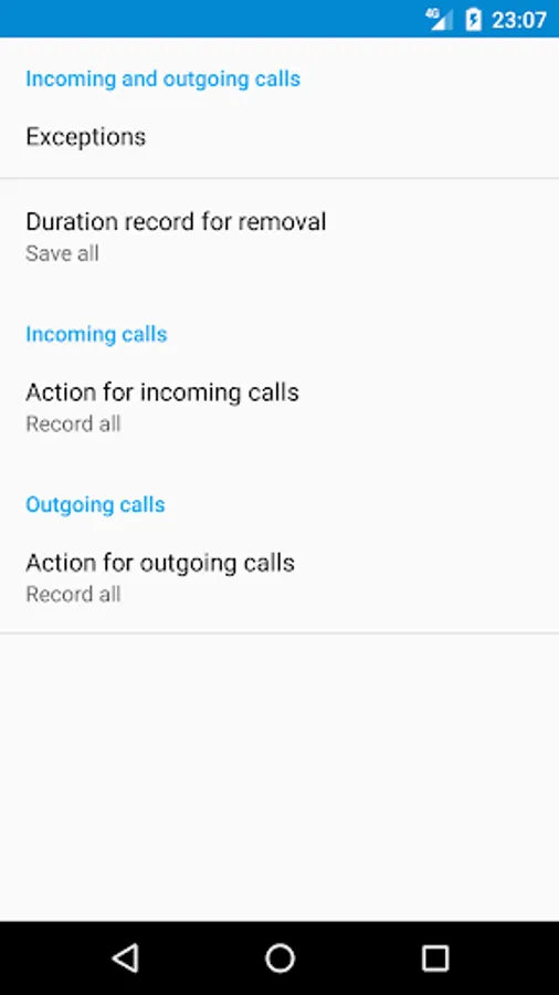 - Individual settings for incoming and outgoing "Save all ", "Do not write", "Record contacts only", "Record contacts not only " (only in the full version )
