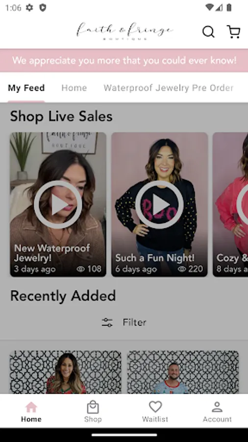 Hand picked items arriving weekly! Clothing, accessories, and other fun finds. Family owned and operated from the great state of Arkansas. Watch live sales or shop our inventory straight from the app! We hope to bring you a little Faith & Fringe!
